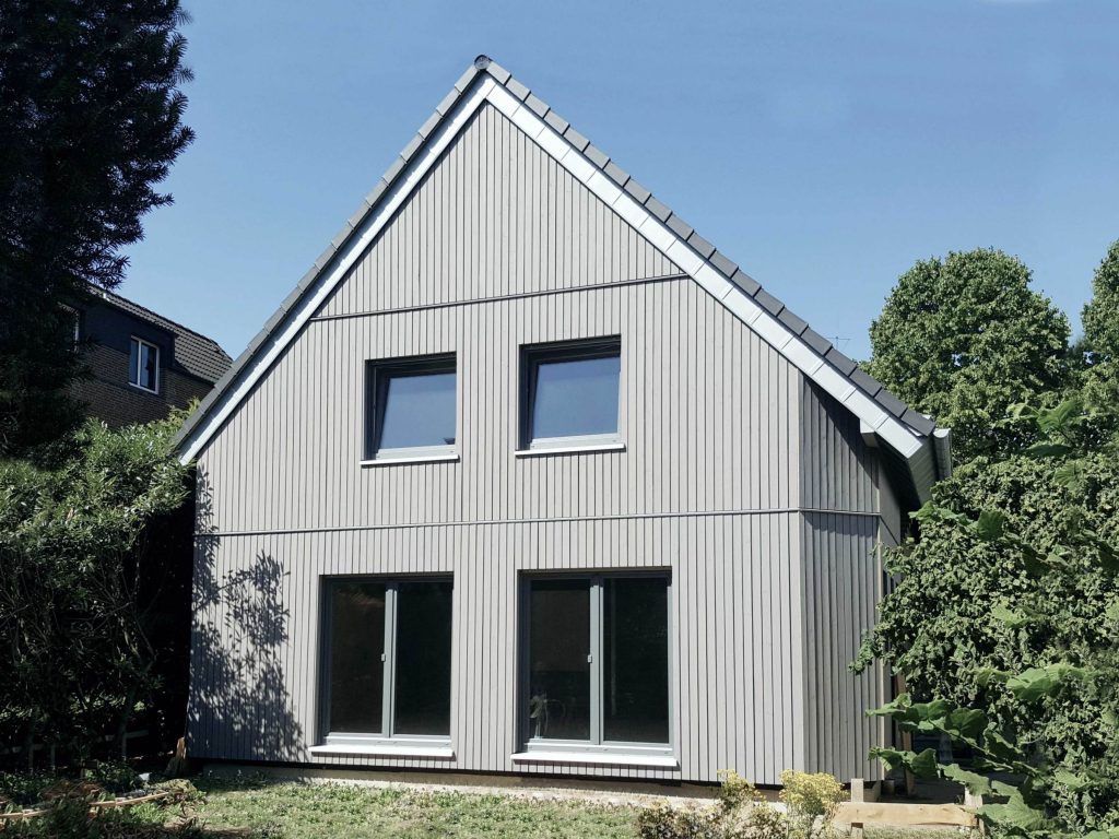 Gleiche Form, aber eine unterschiedliche Fassade: Als Kontrast zum rot verklinkerten Bestand erhielt der Anbau eine senkrechte Lärchenfassade im Farbton kieselgrau.