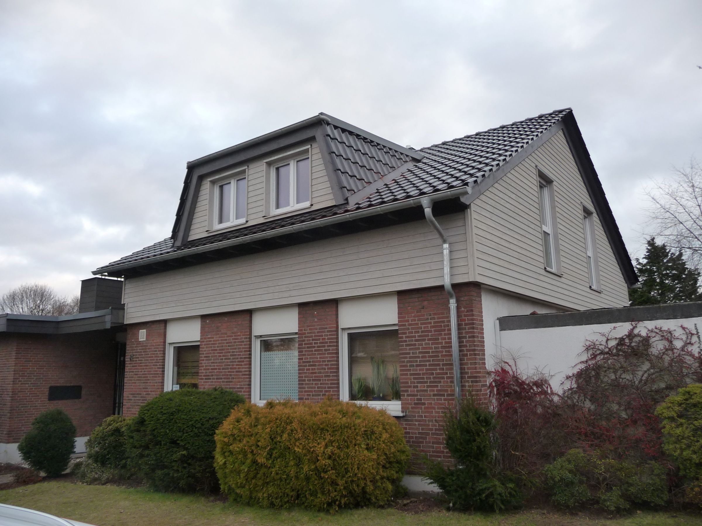 Das bereits vorhandene Flachdachhaus ist durch eine Aufstockung mit Satteldach um ein gesamtes Stockwerk erweitert worden. Die beiden Gauben, jeweils auf der Längsseite des Gebäudes, sorgen zu dem für weiteren Wohnraum und Komfort. Mit einer silbergrauen Fassadenschalung aus Holz setzt sich die neue Etage optisch vom rot verklinkerten Erdgeschoss ab.