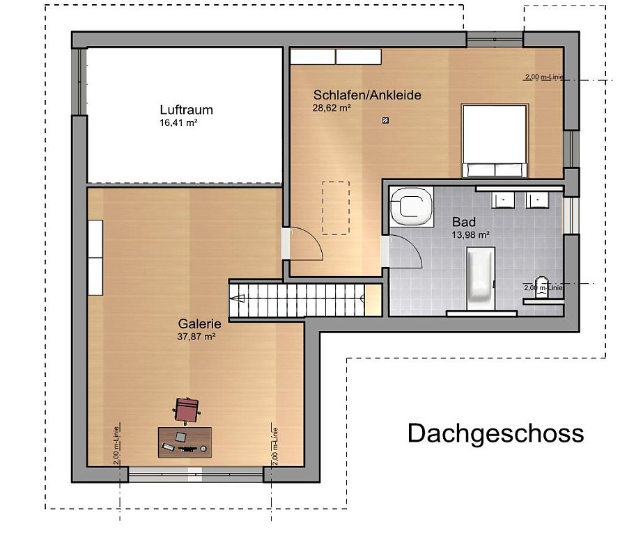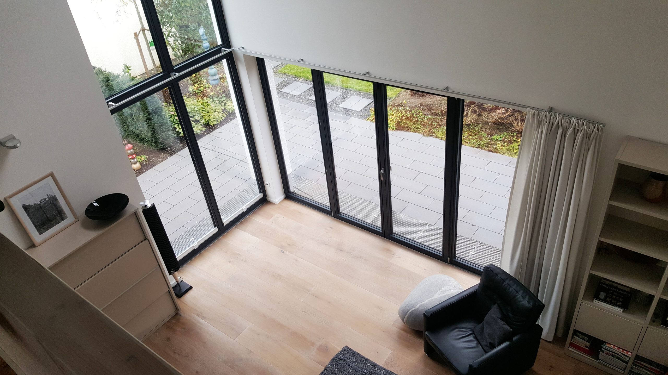 Dach- und Erdgeschoss werden durch eine offene Galerie und ein ca. 3,60 m hohes Fensterelement optisch miteinander verbunden. Die Fensterelemente in anthrazitgrau bringen nicht nur viel Licht in den Wohnbereich, sondern dienen auch als moderne Gestaltungselemente in der ansonsten schlicht gehaltenen, hellen Außenfassade.