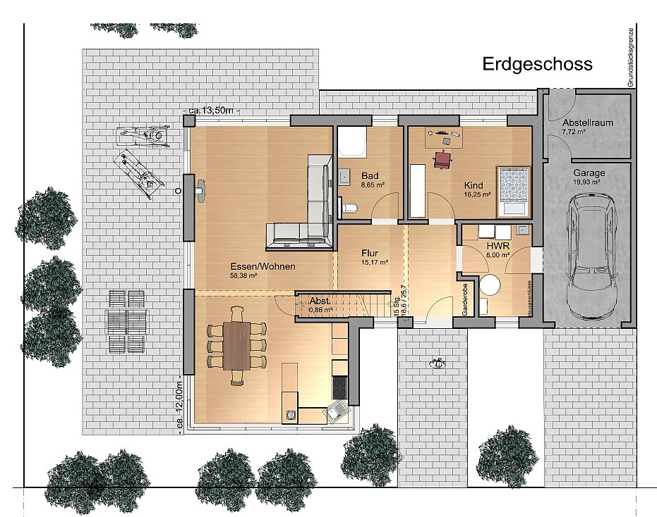 Abgerundet wird das schlüsselfertig in Holzrahmenbauweise gefertigte Wohnhaus von einem Kellergeschoss aus Mauerwerk mit Garage. Für wohlige Wärme an kalten Tagen sorgt eine Fußbodenheizung, die dank Erdwärmepumpe besonders nachhaltig betrieben wird.
