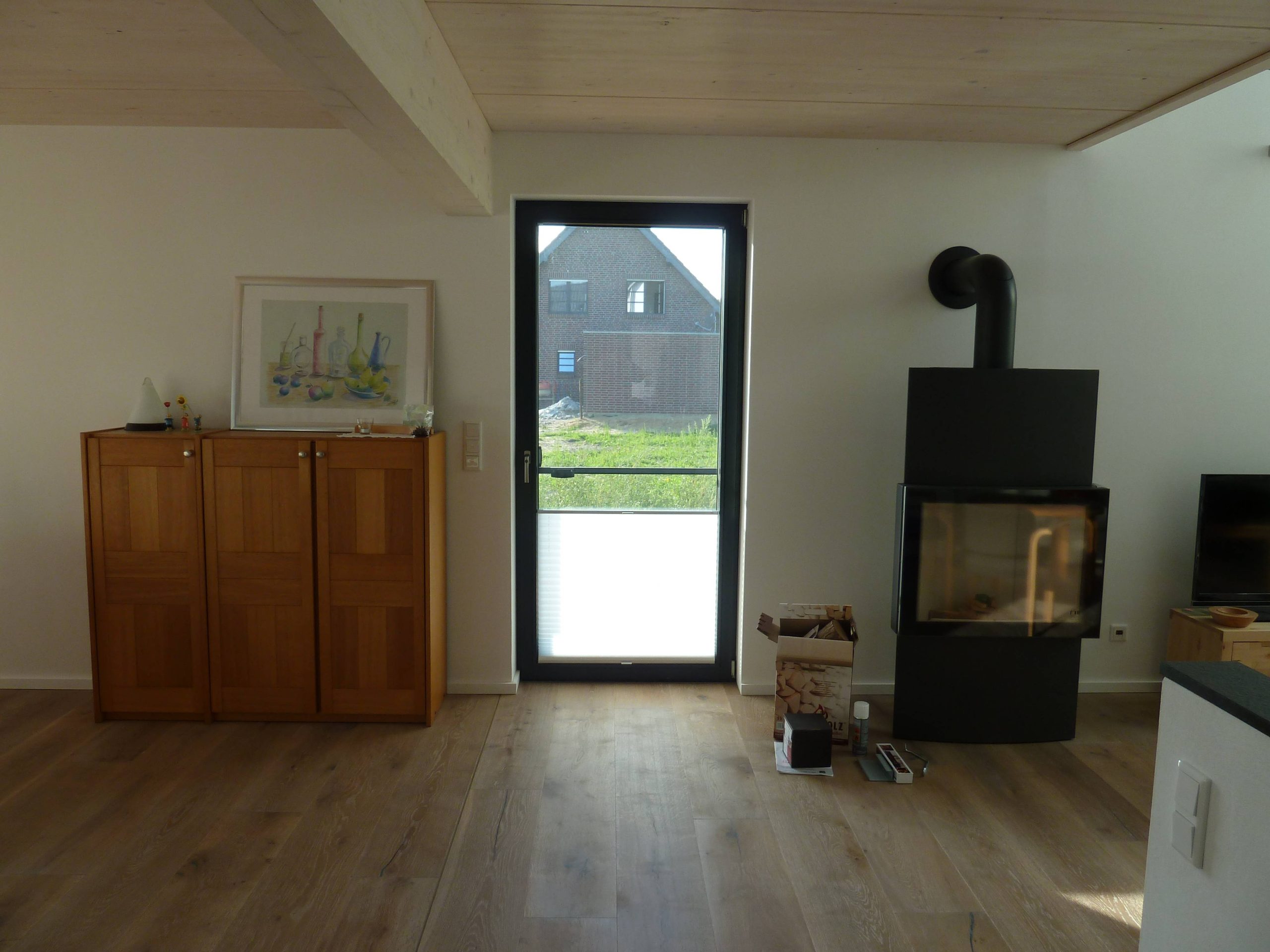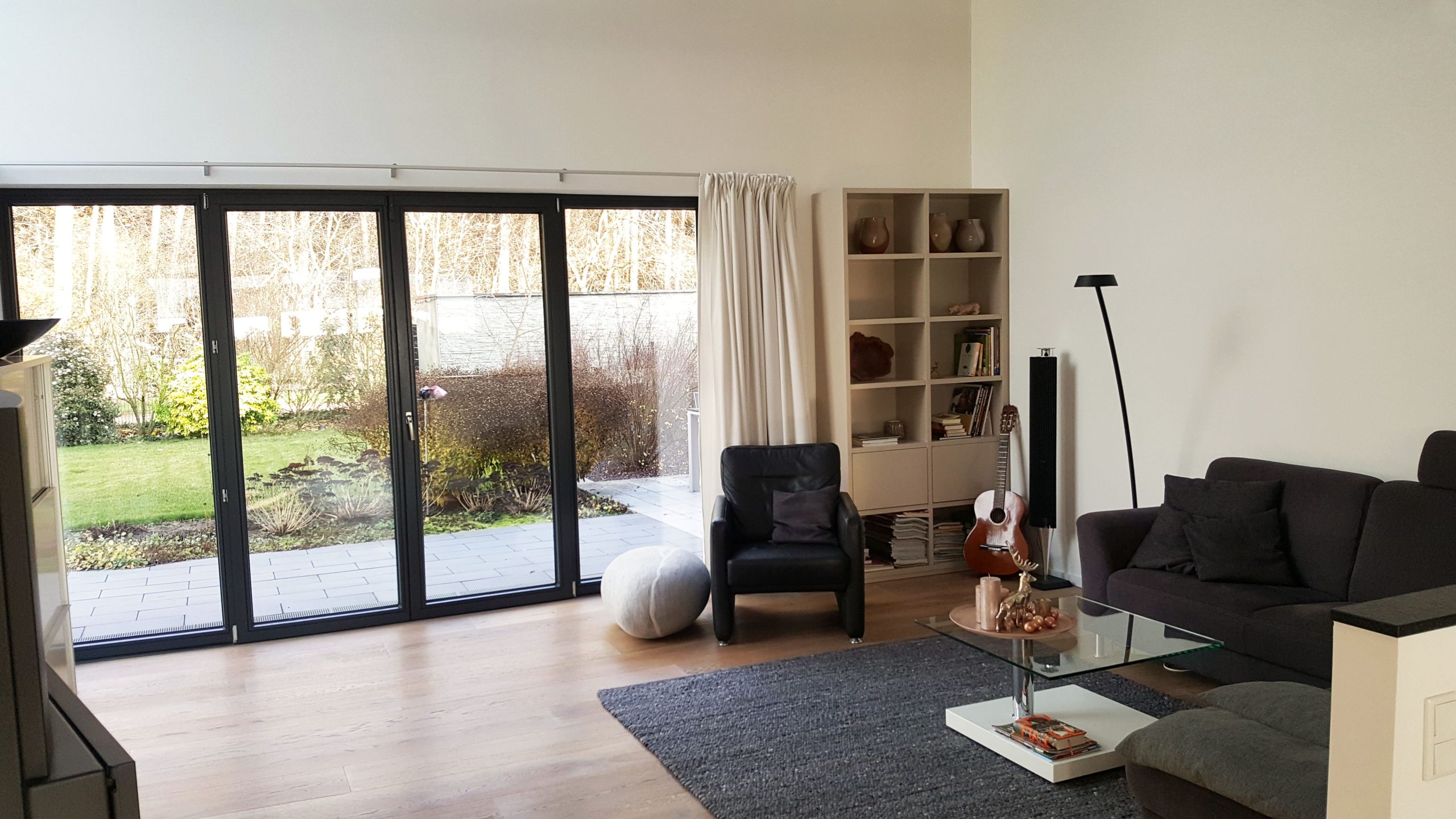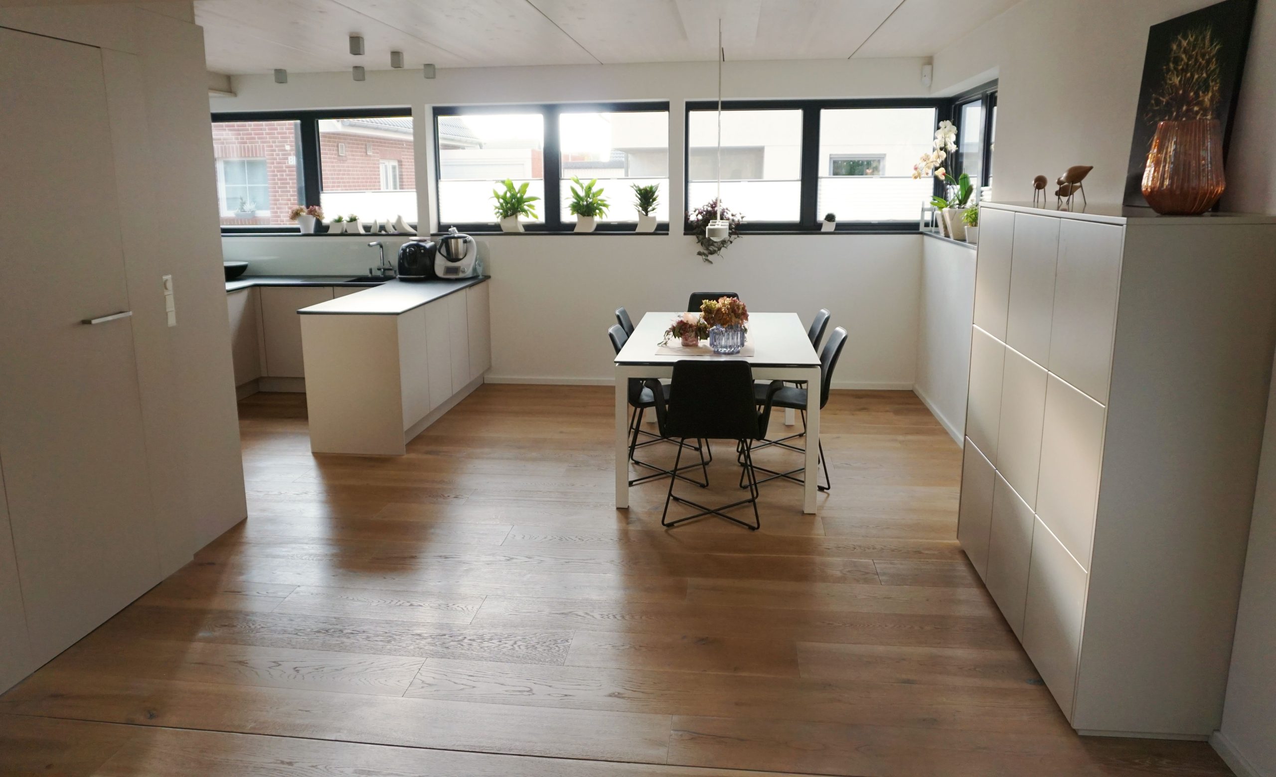 Ein modernes Einfamilienhaus in Brüggen am Niederrhein, individuell zugeschnitten nach den Wünschen und Vorstellungen unserer Bauherren. Die weiß-lasierte Massivholzdecke im Erdgeschoss verbreitet zusammen mit dem Kamin ein gemütliches Ambiente zum Entspannen und Wohlfühlen.
