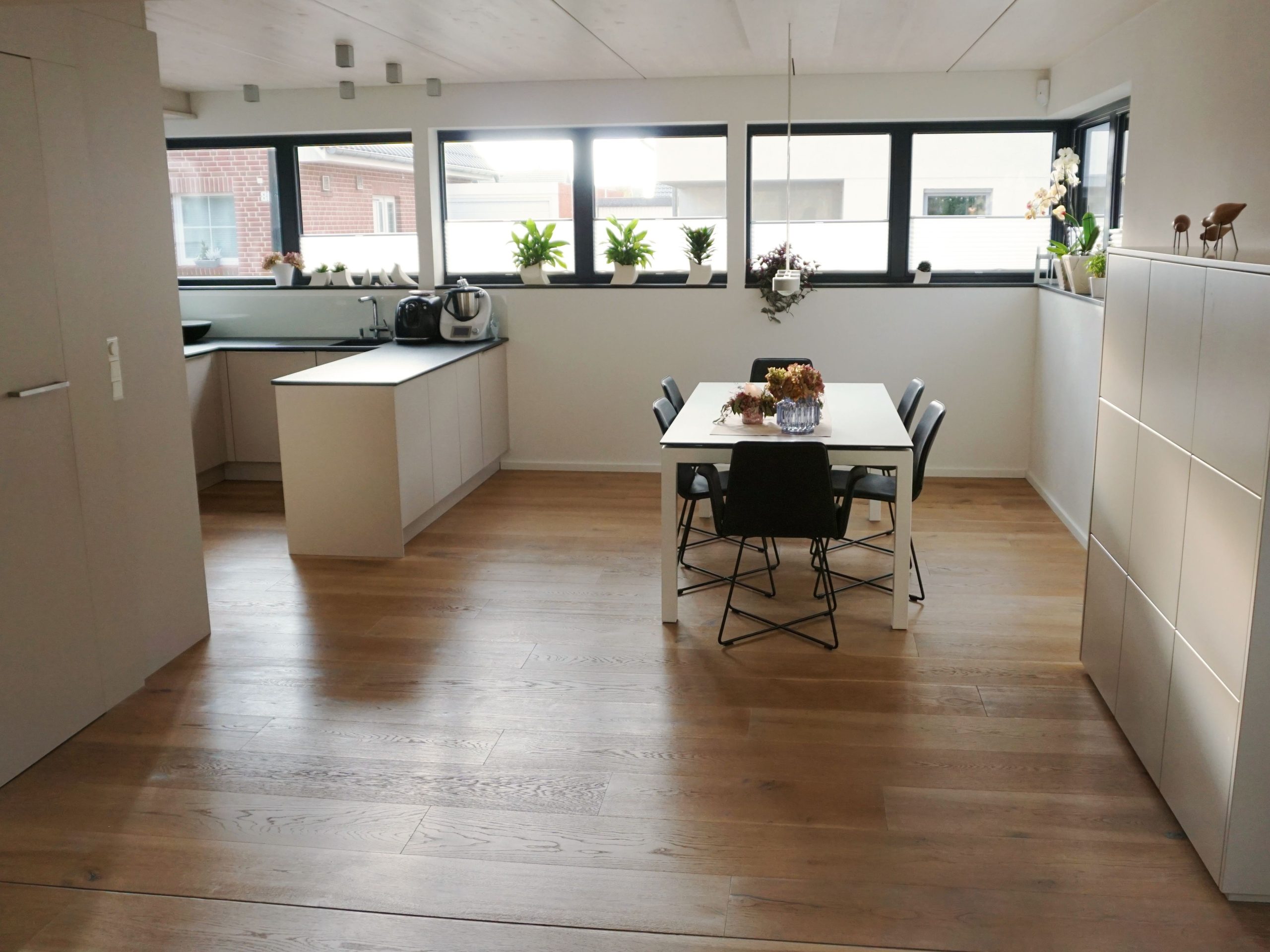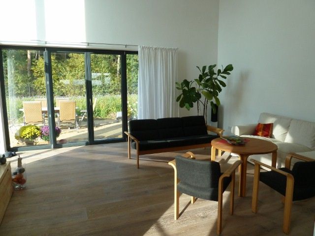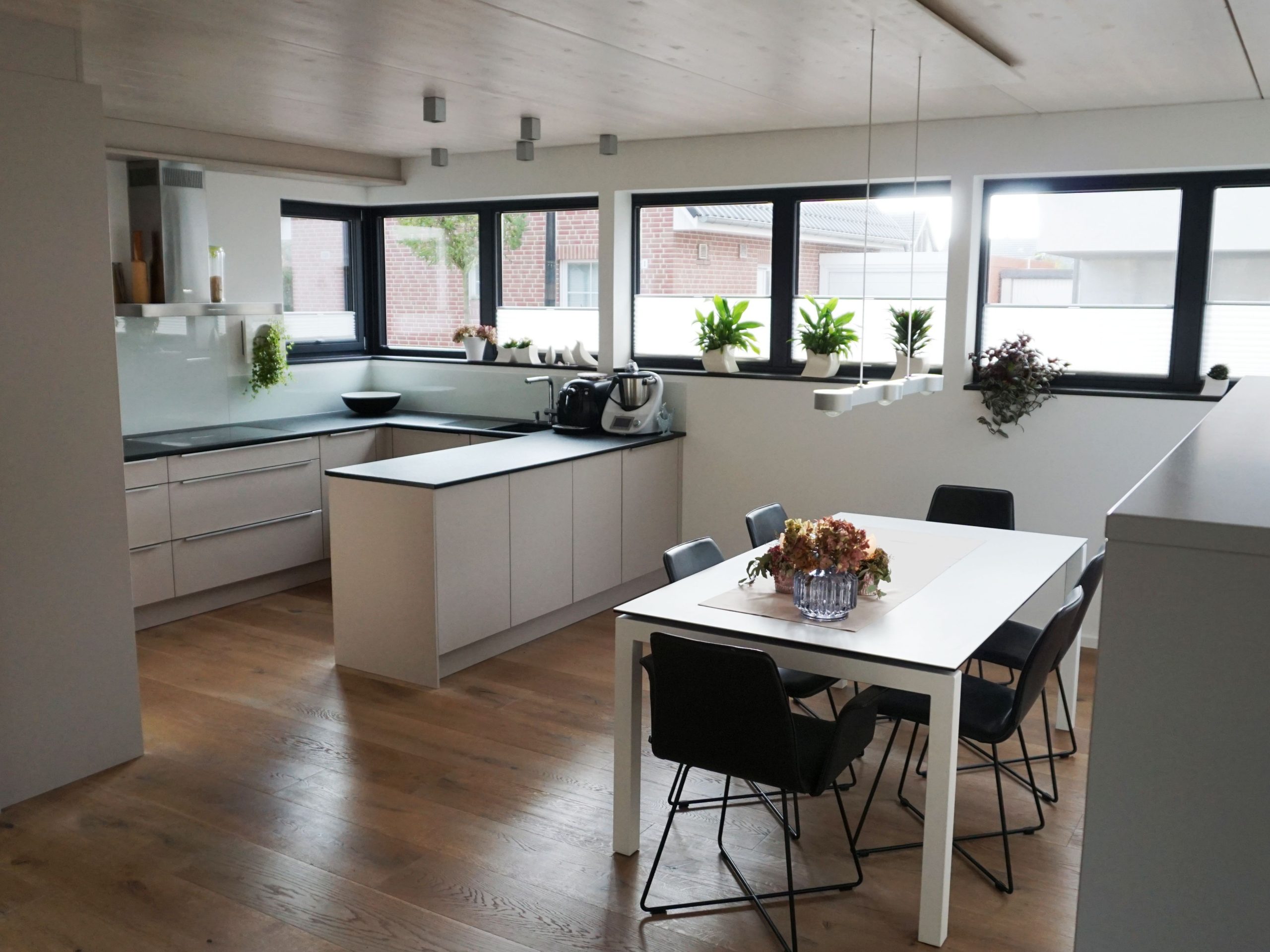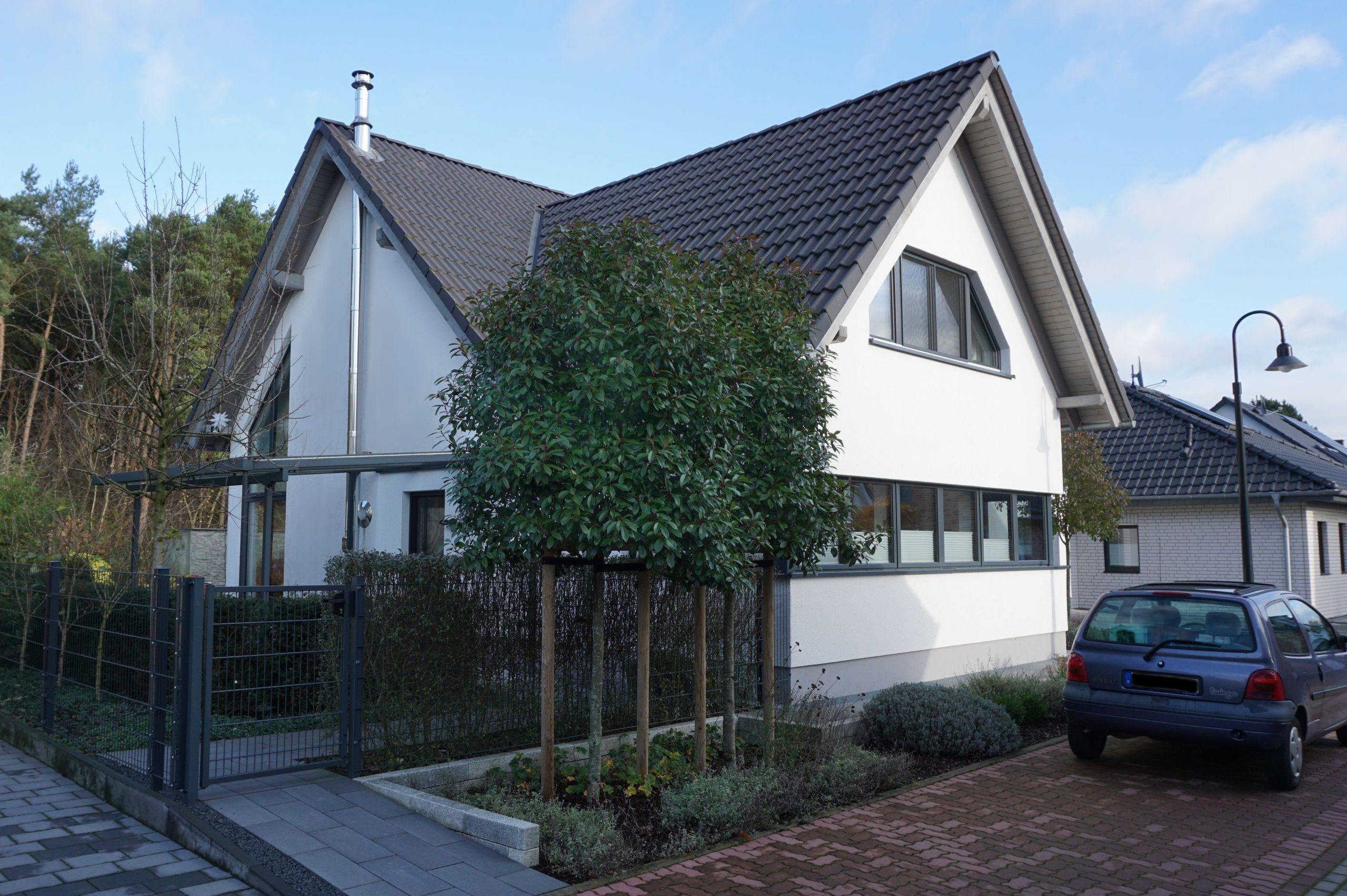 Ein modernes Einfamilienhaus in Brüggen am Niederrhein, individuell zugeschnitten nach den Wünschen und Vorstellungen unserer Bauherren. Die weiß-lasierte Massivholzdecke im Erdgeschoss verbreitet zusammen mit dem Kamin ein gemütliches Ambiente zum Entspannen und Wohlfühlen.
