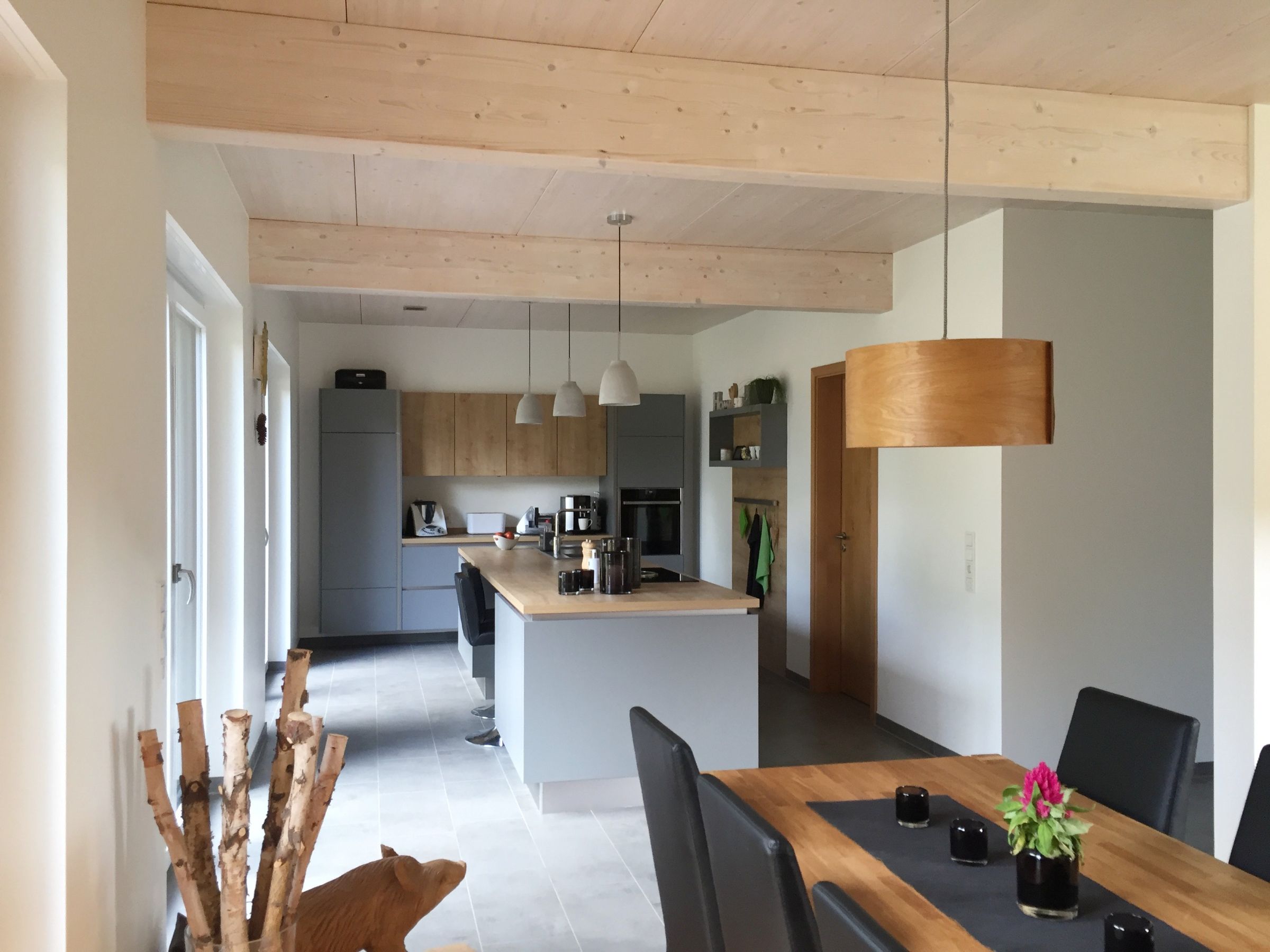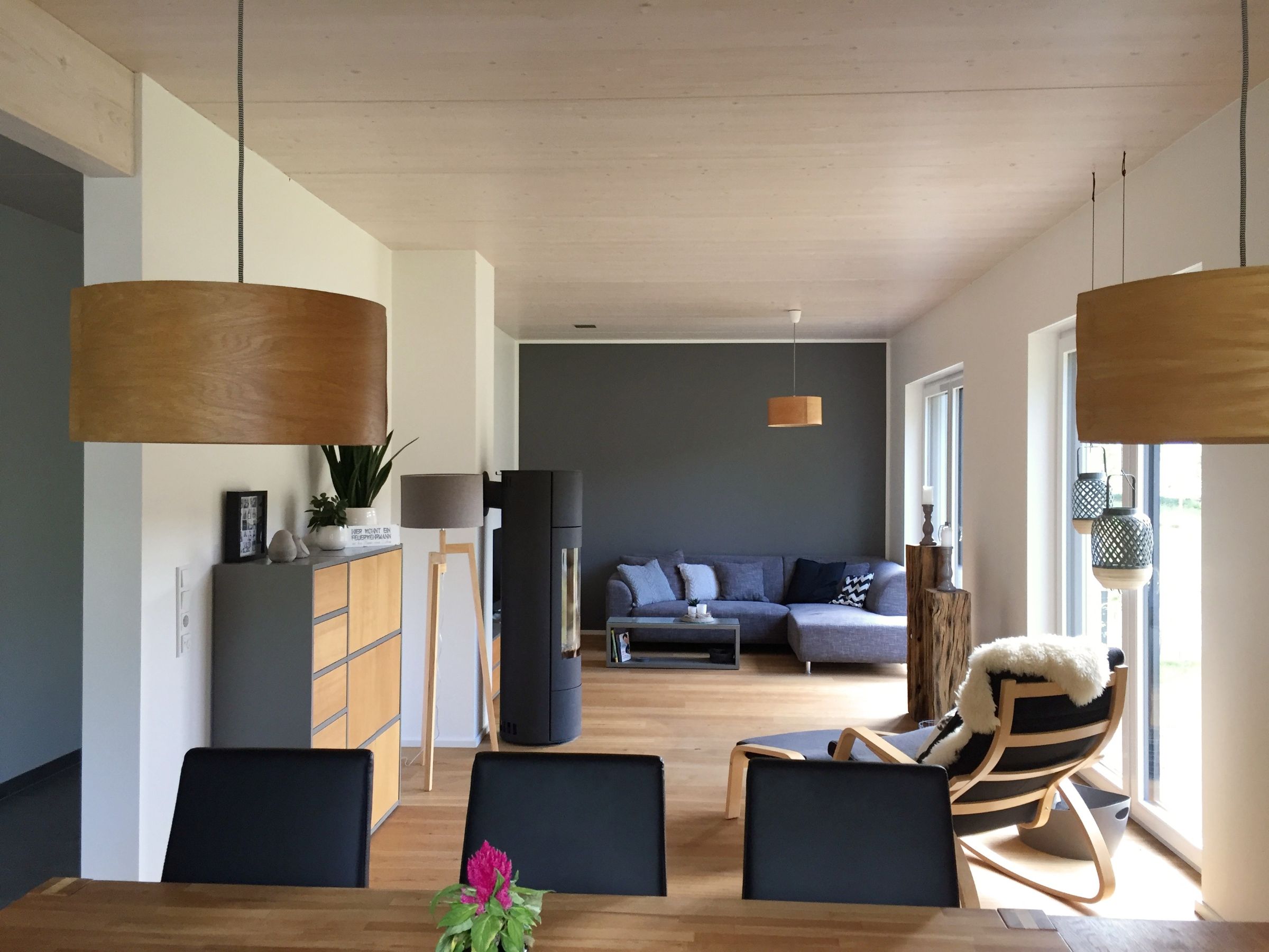 Von außen durch die Putzfassade weitestgehend versteckt, zeigt der natürliche Baustoff Holz im Inneren des Gebäudes Präsenz. Unterseitig sichtbare Massivholzdecken über Erd- und Obergeschoss sorgen in den Wohnräumen für einen einzigartigen Anblick und eine „warme“ Ausstrahlung.