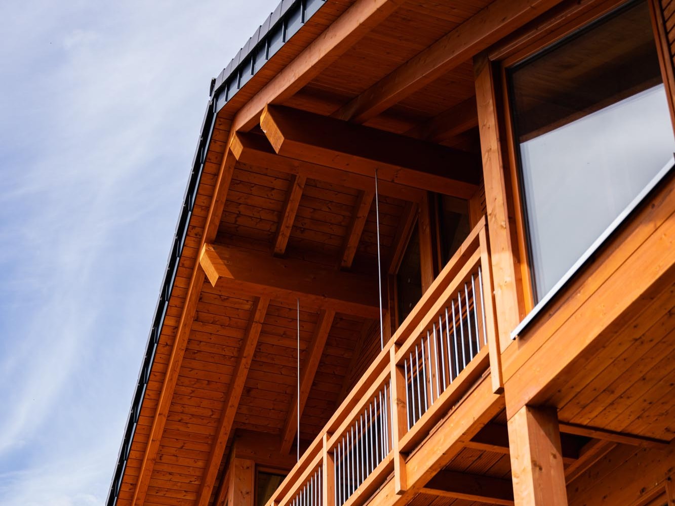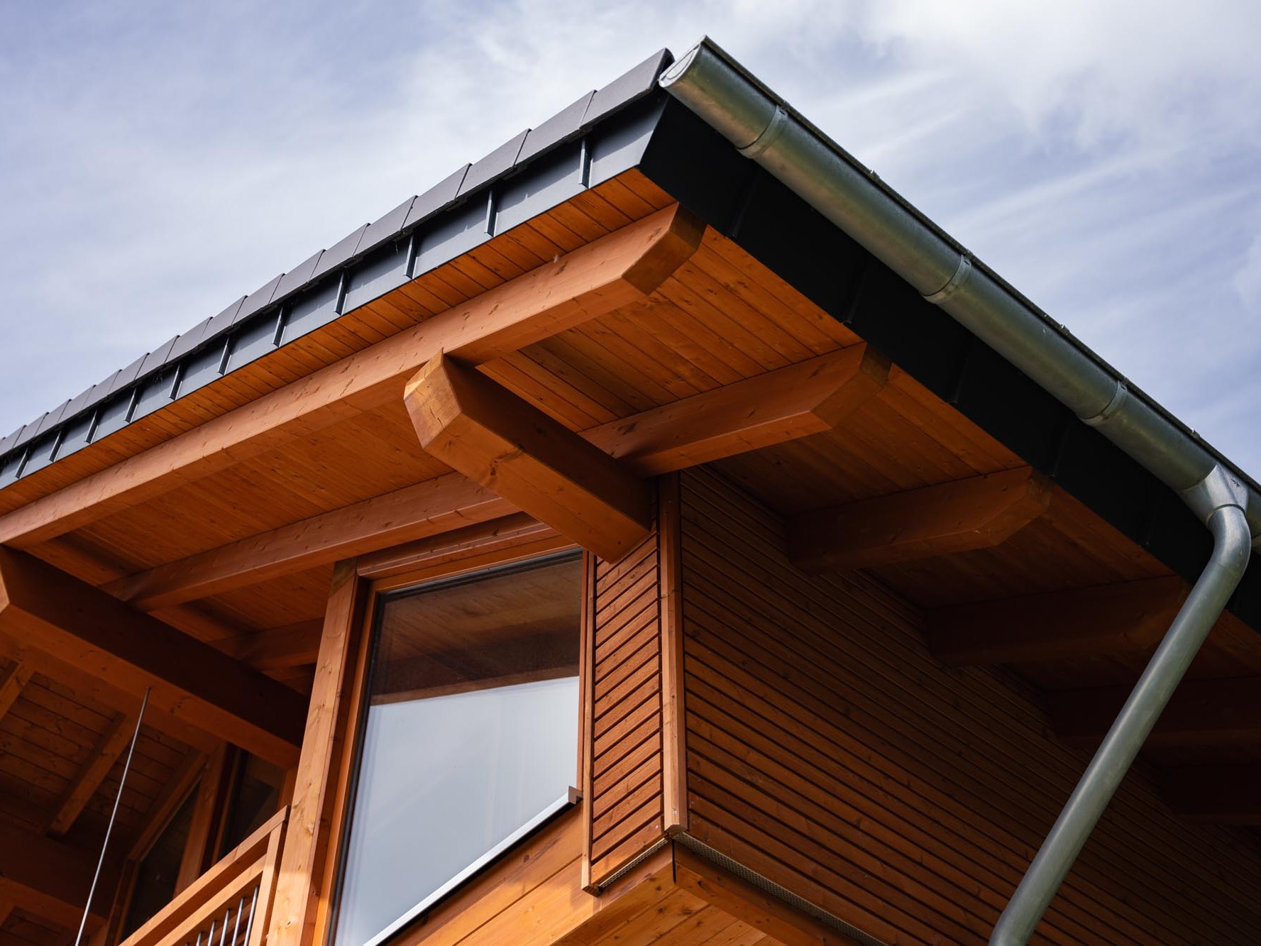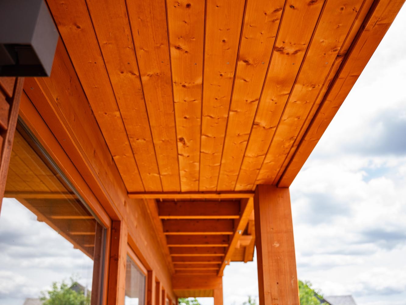 Seine Naturverbundenheit zeigt das Einfamilienhaus mit seiner waagerechten Holzfassade aus Lärche und der überdachten Balkonkonstruktion am Südgiebel bereits auf den ersten Blick. Die verbauten Holzfenster und die Holzhaustür unterstreichen den besonderen Charakter des Einfamilienhauses und fügen sich harmonisch in das einheitliche Erscheinungsbild mit viel Holz ein. Das Satteldach wurde mit gewelltem Betondachstein eingedeckt.