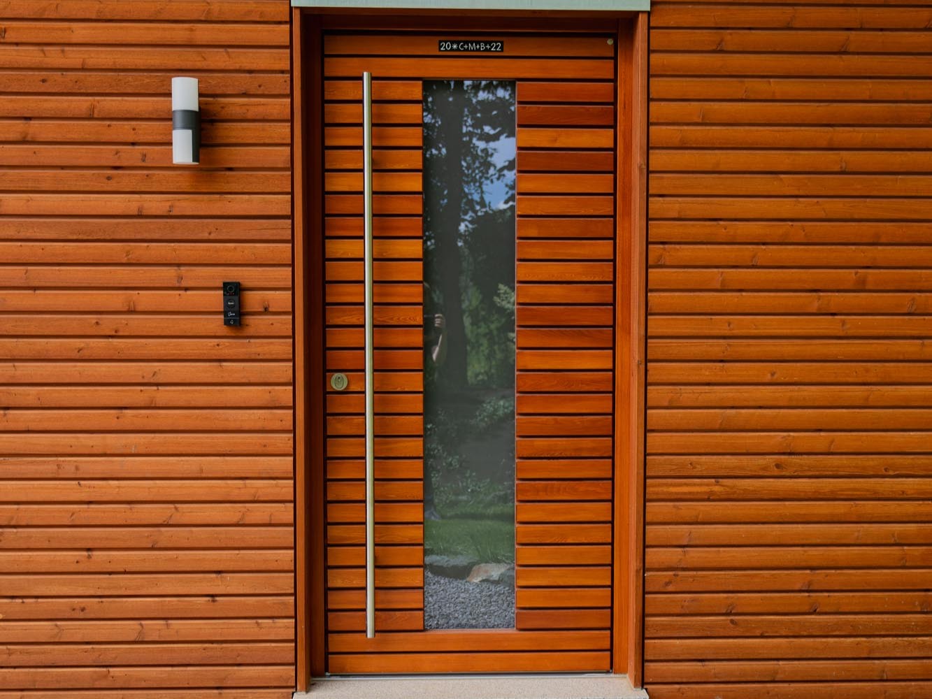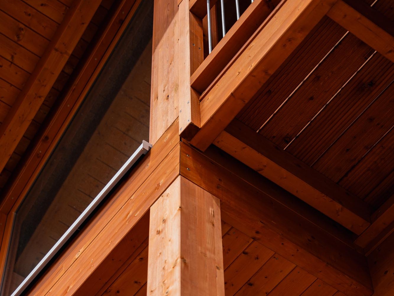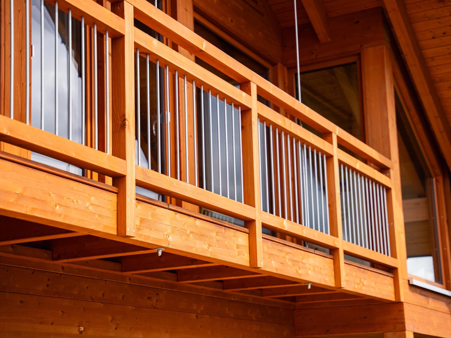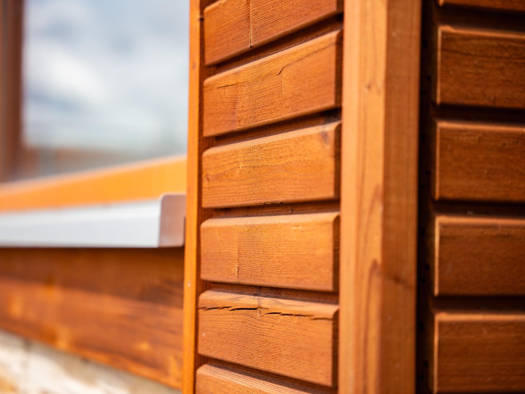 Seine Naturverbundenheit zeigt das Einfamilienhaus mit seiner waagerechten Holzfassade aus Lärche und der überdachten Balkonkonstruktion am Südgiebel bereits auf den ersten Blick. Die verbauten Holzfenster und die Holzhaustür unterstreichen den besonderen Charakter des Einfamilienhauses und fügen sich harmonisch in das einheitliche Erscheinungsbild mit viel Holz ein. Das Satteldach wurde mit gewelltem Betondachstein eingedeckt.
