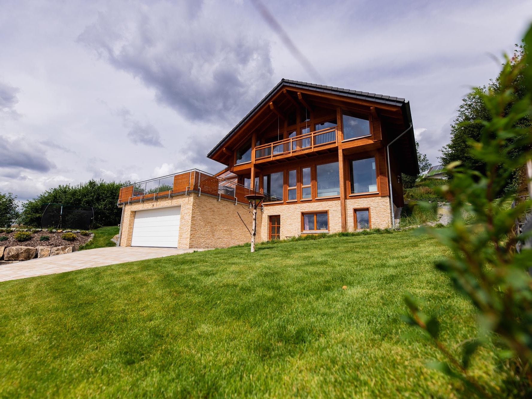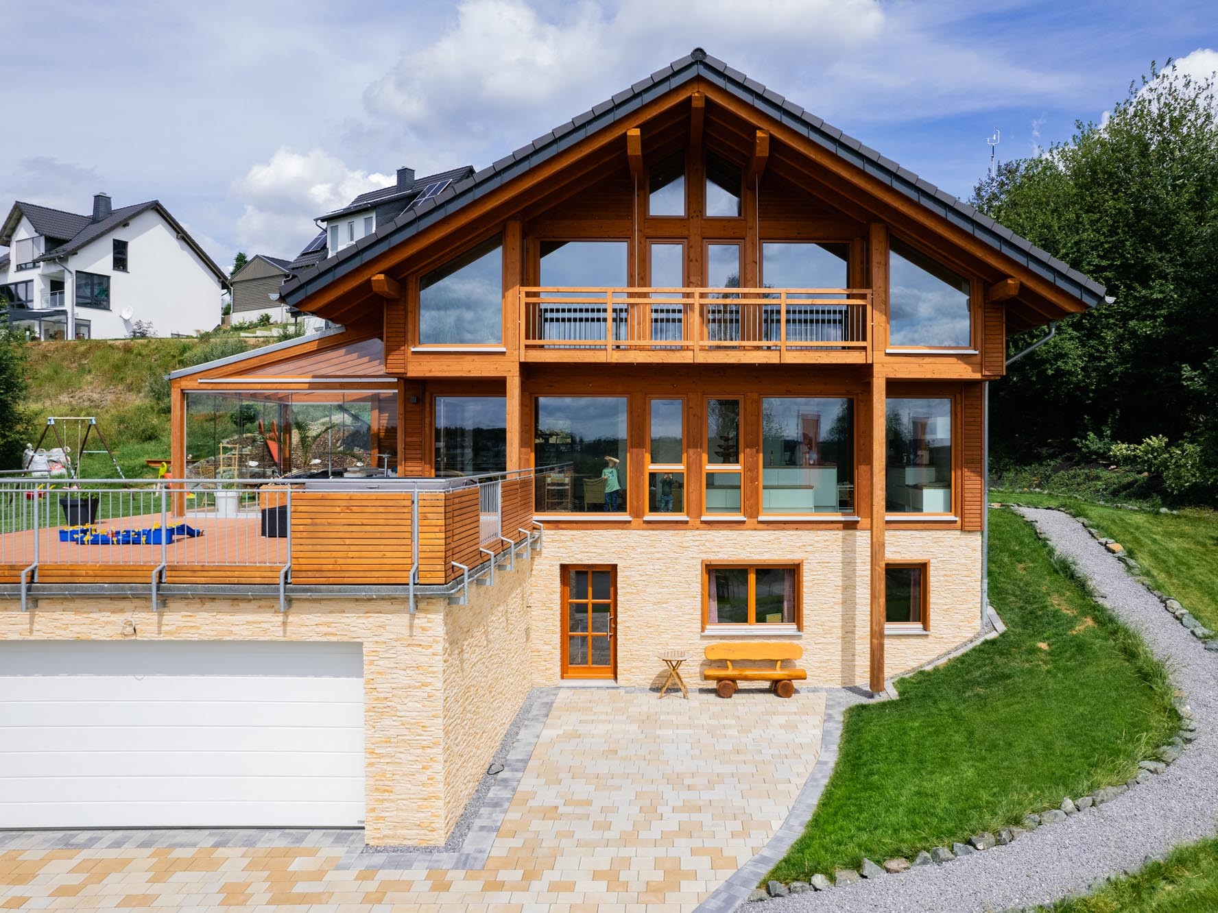 Holz, Glas und Licht, wohin das Auge blickt: mit ihrem großzügig bemessenen Einfamilienhaus inklusive Einliegerwohnung hat sich diese Baufamilie ihren Traum vom Eigenheim erfüllt. Mit ausladender Terrasse und Wintergarten gibt es rund um das Haus Möglichkeiten zur Erholung zu jeder Jahreszeit – fabelhafte Ausblicke inklusive.