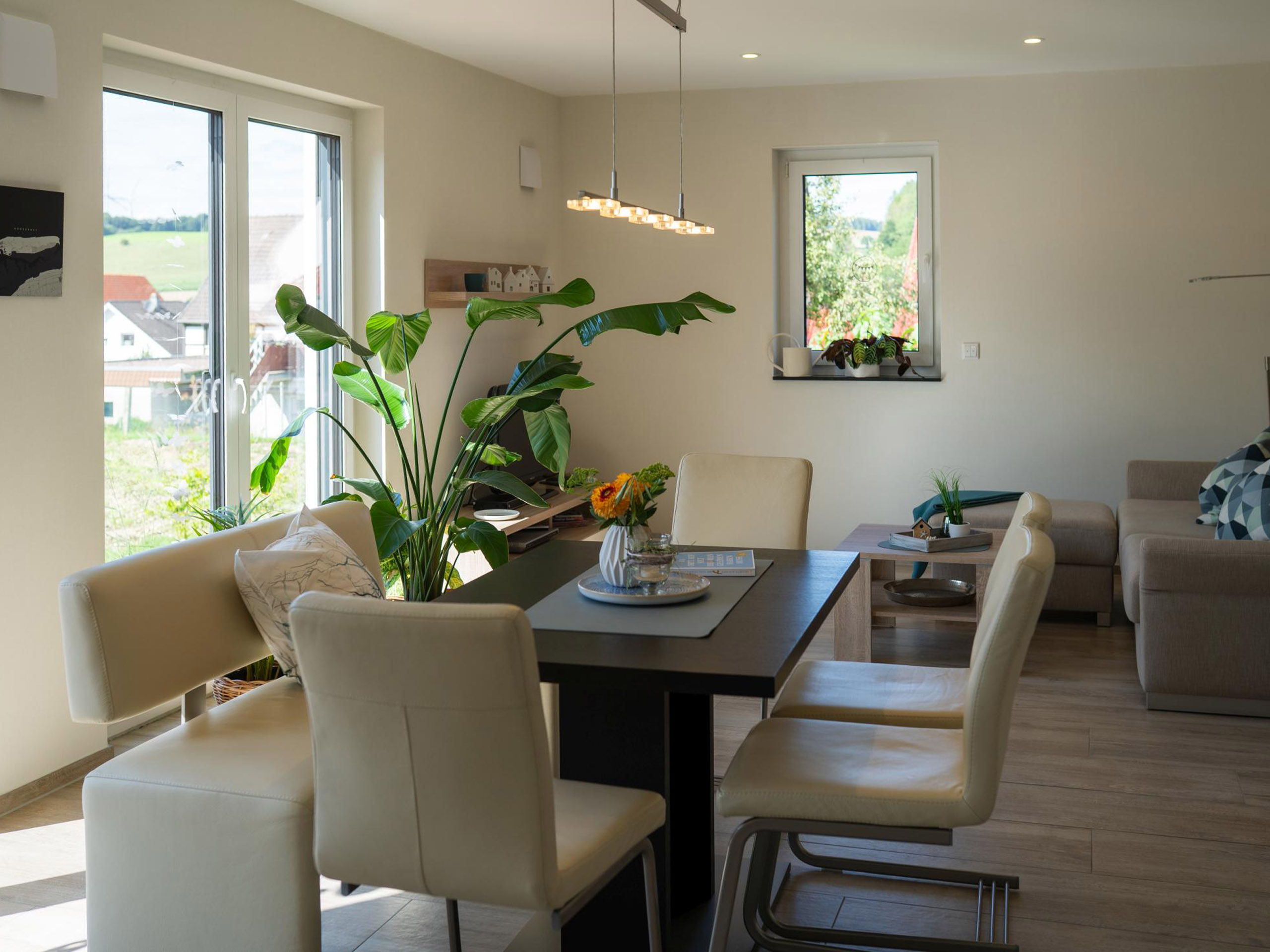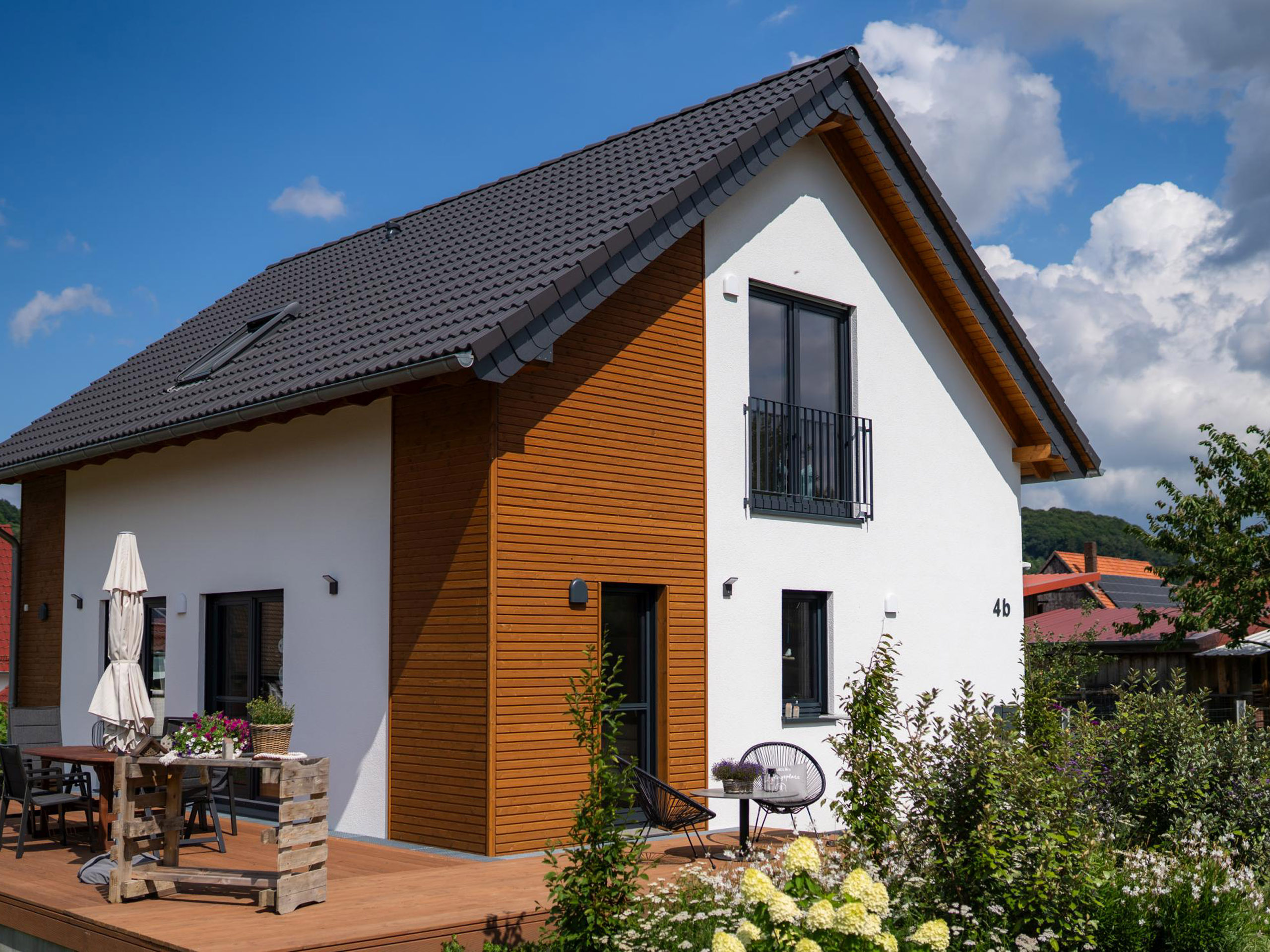 Das neu gebaute Einfamilienhaus in Lichtenau überzeugt durch seine klare Formensprache, funktionale Raumaufteilung und eine zeitgemäße Architektur, die Licht, Offenheit und Behaglichkeit miteinander verbindet. Die Kombination aus verputzter Fassade und einer horizontalen Holzverschalung im Rhombusprofil verleiht dem Gebäude ein modernes, zugleich naturnahes Erscheinungsbild. Großzügige Fensterflächen und ein offener Wohn-Essbereich schaffen eine helle und wohnliche Atmosphäre.