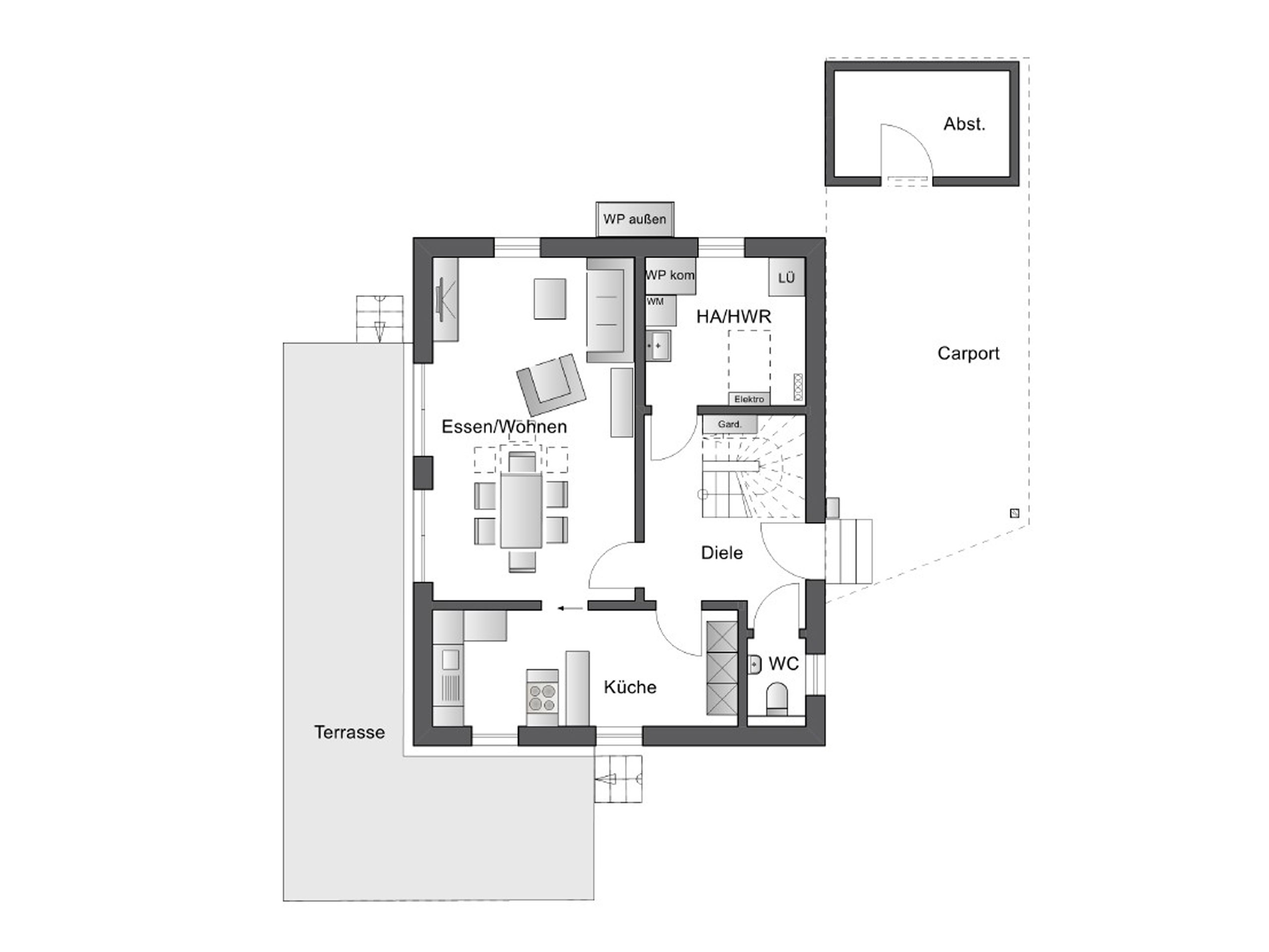 Das Haus wurde in Holzrahmenbauweise realisiert und als technikfertiges Objekt übergeben. Im Leistungsumfang von Wiese und Heckmann enthalten waren neben Entwurf und Bauantrag auch die gesamte Gebäudehülle inklusive Dacheindeckung, Fenster, Haustür und Fassade sowie die Installation der technischen Gewerke: Elektroarbeiten, Heizung, Sanitär und Estrich. Ergänzt wird das Wohnhaus durch einen überdachten Carport mit integriertem Abstellraum.