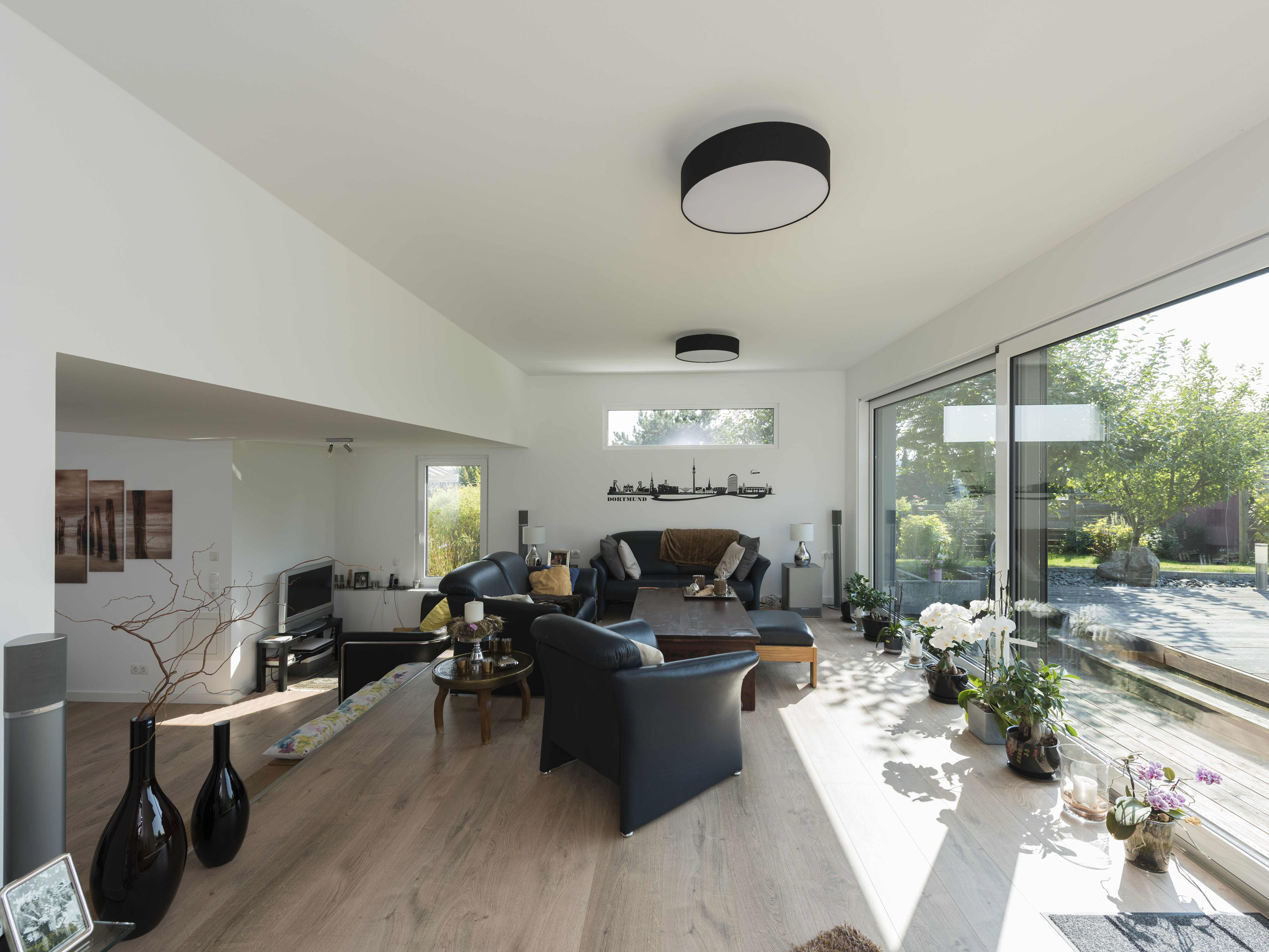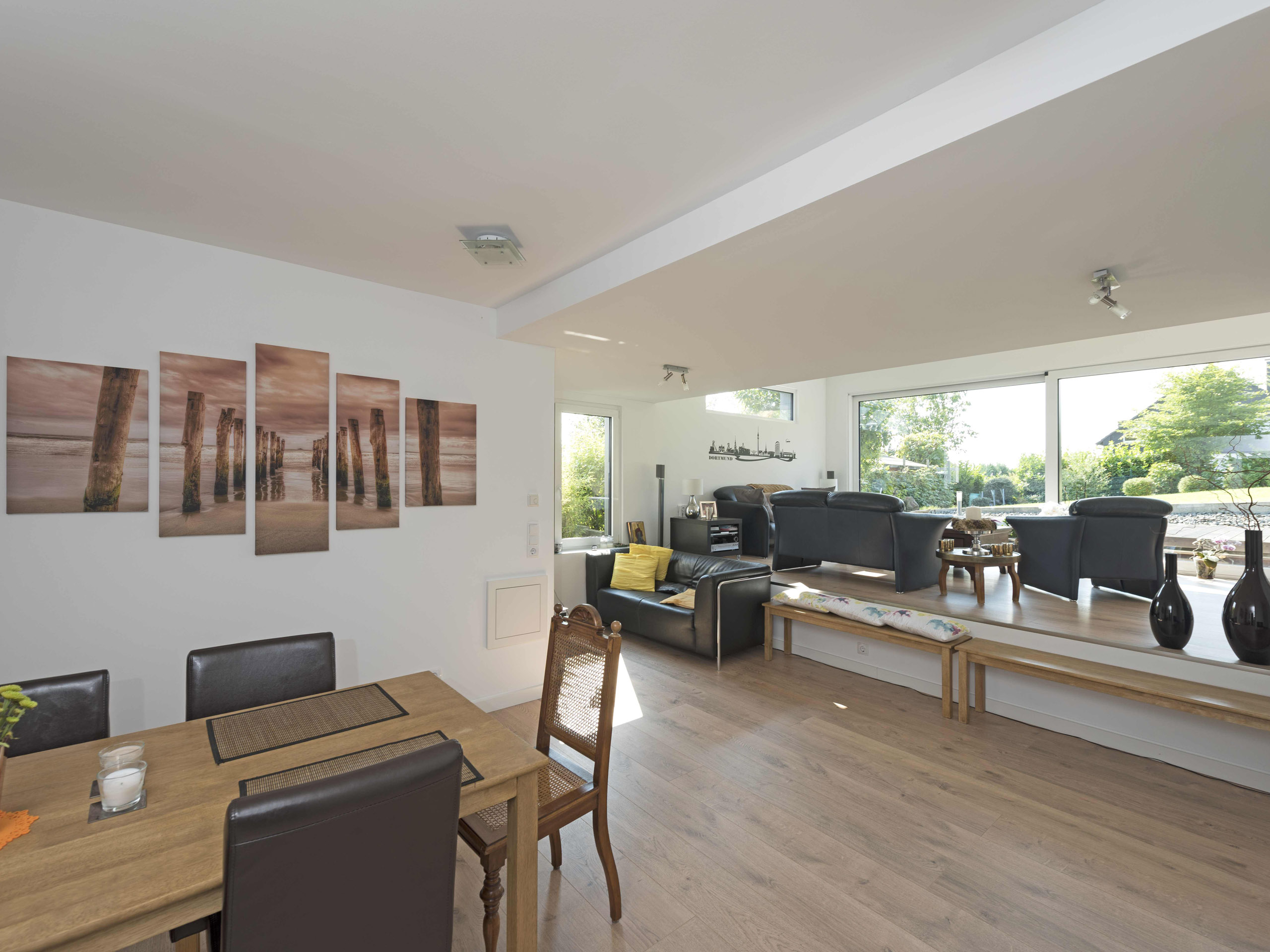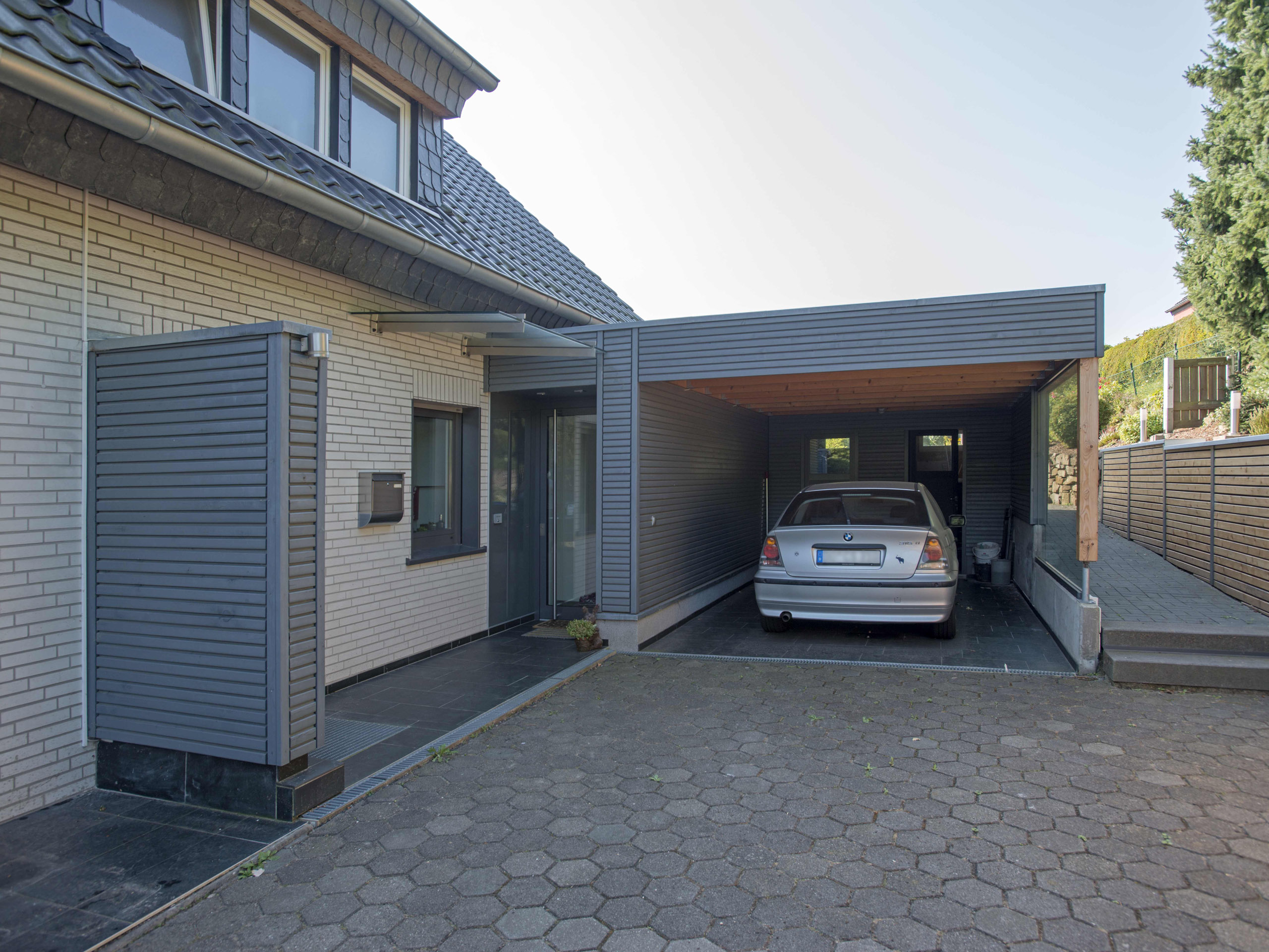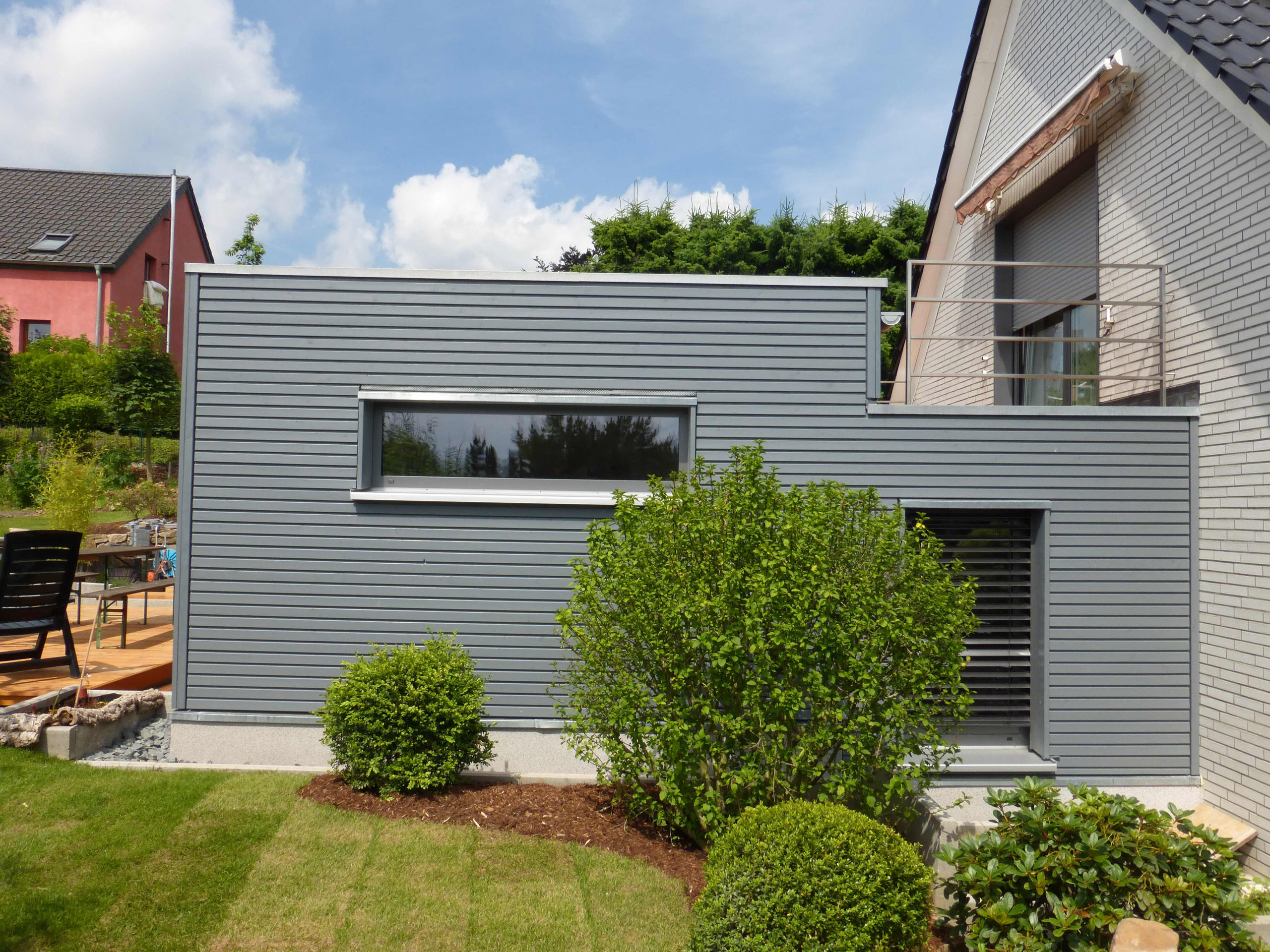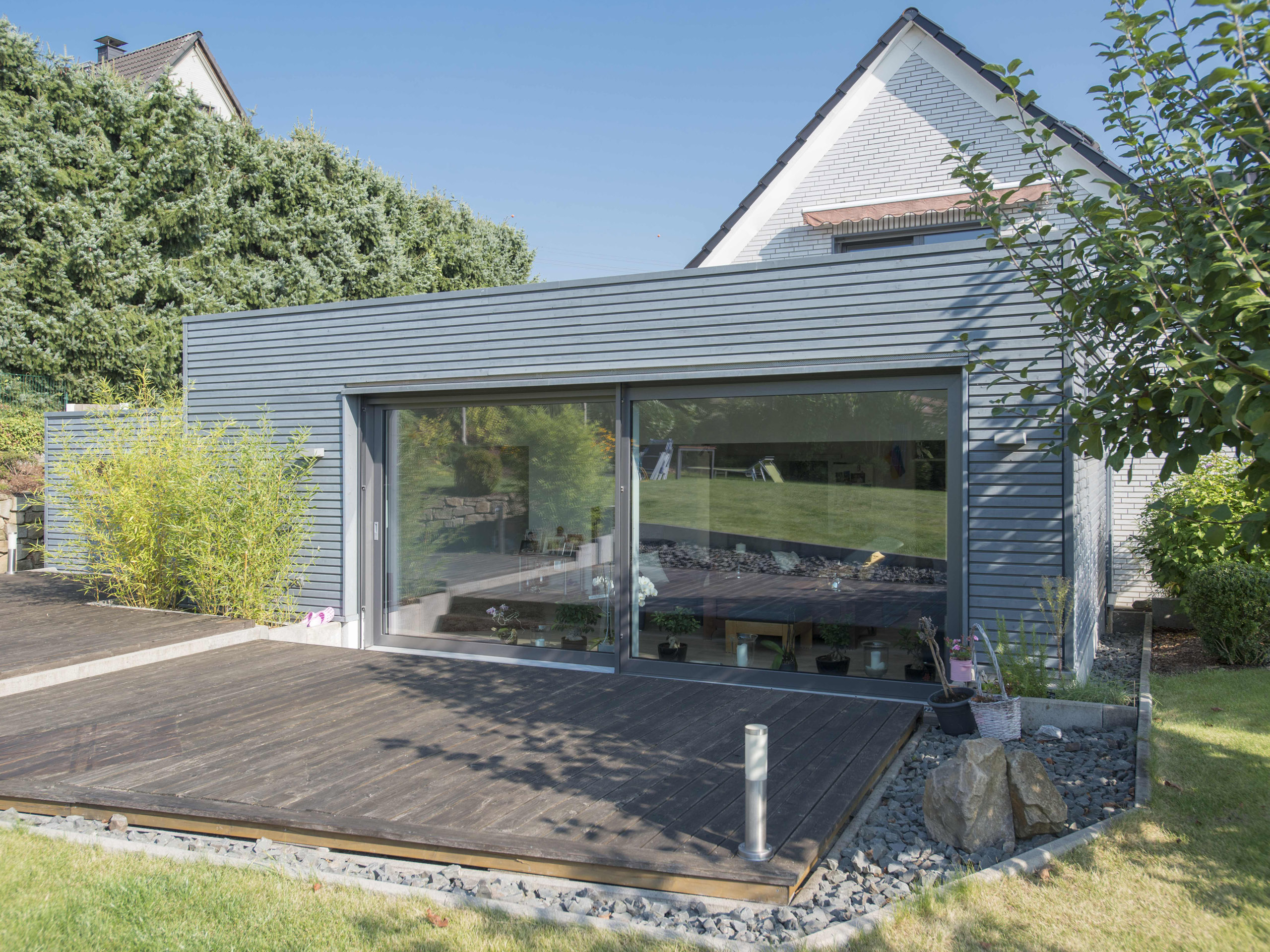 Mehr Raum zum Wohnen und eine neue Garage mit Abstellraum waren die Wünsche der Bauherren. Der weitläufige Garten bot ausreichend Platz, um genau diese Vorstellungen verwirklichen zu können. Im nicht ganz 40 Quadratmeter großen Flachdachanbau erstreckt sich eine stilvolle und elegante Wohnlandschaft. Die Eleganz der Innenräume spiegelt sich auch optisch in der Fassadengestaltung wieder: Ein schlichter Kubus mit Ausstrahlung.