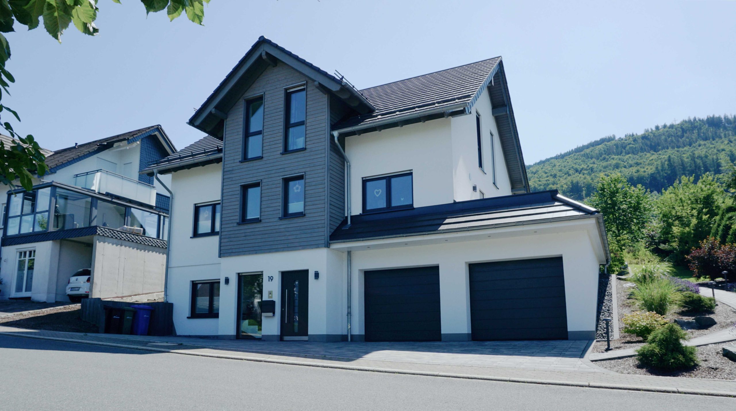Dieses klassische Einfamilienhaus ist der Beweis dafür, dass auch auf einem Grundstück mit Hanglage ein bemerkenswertes und ansehnliches Haus entstehen kann. Auf drei Etagen wurden die Wohnwünsche und Ideen der Bauherren in die Tat umgesetzt und ein großzügiges Zuhause für vier Personen geschaffen.