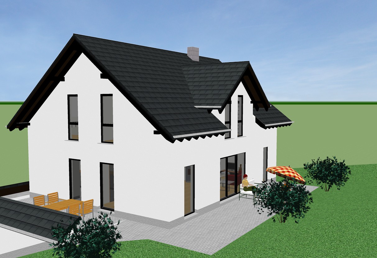 Im Erdgeschoss, dem Herzstück des Wohngeschehens, befindet sich ein offener Wohn- und Essbereich, die Küche, ein WC und ein Abstellraum. Ergänzt werden die Wohnräume durch eine großzügige Terrasse. Praktisch: Dank der breit angelegten Doppelgarage im Kellergeschoss konnte die Terrasse nicht nur hinter dem Haus, sondern auch neben dem Haus im Bereich des abfallenden Geländes angelegt werden. Die ums Eck laufende Terrasse fällt durch den Bereich auf der Garage deutlich größer aus und fängt auch zu späteren Tageszeiten wärmende Sonnenstrahlen ein.