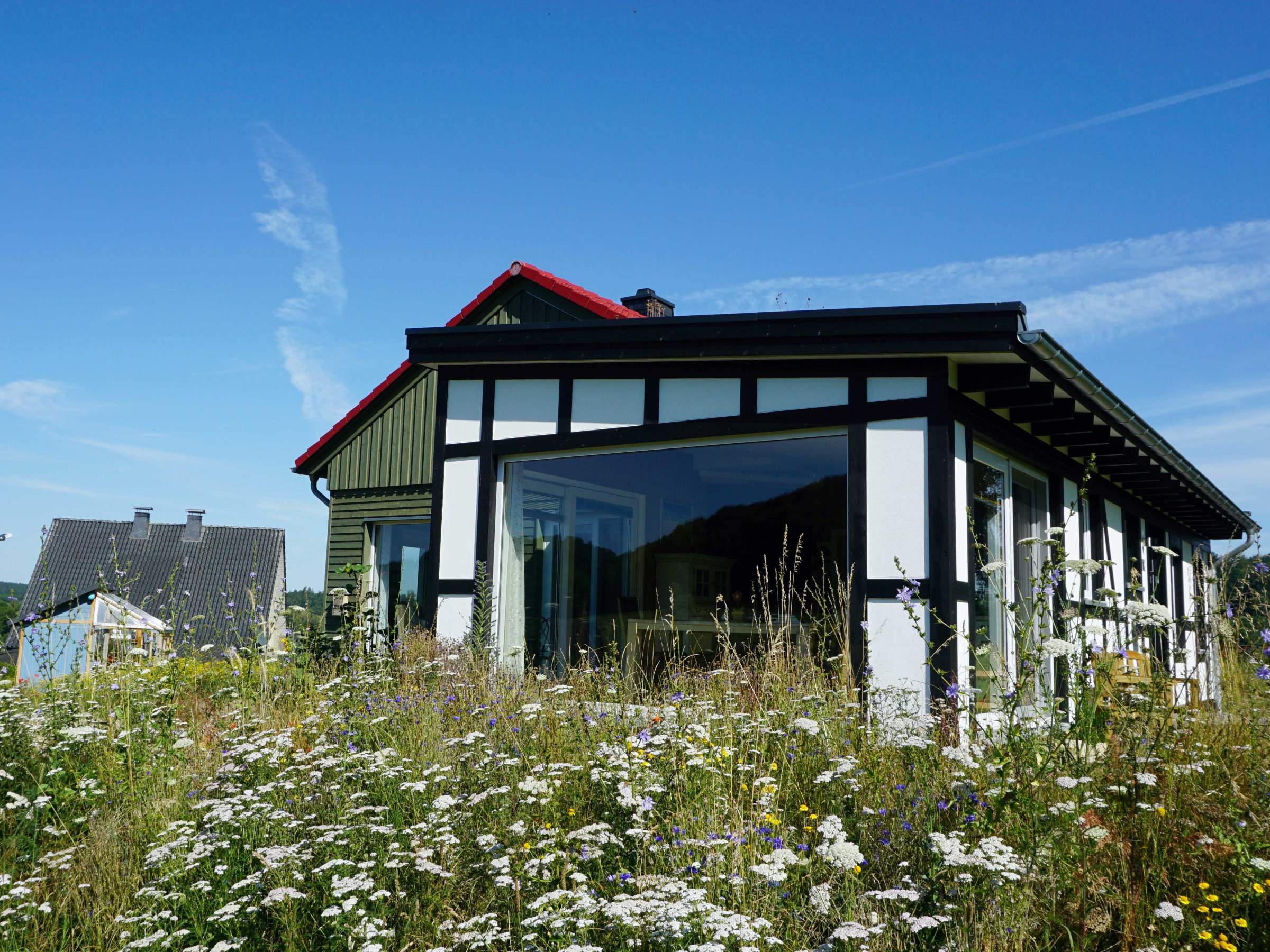 Die Verbundenheit und Nähe zur Natur zeigt sich nicht nur in der durchgängigen Präsenz des Naturbaustoffes Holz, sondern spiegelt sich auch in den liebevoll ausgewählten Elementen rund ums Haus und der Gestaltung der Außenanlagen wieder. Ringsum blüht die wilde Blumenwiese und bildet den perfekten Rahmen für das Wohnhaus.