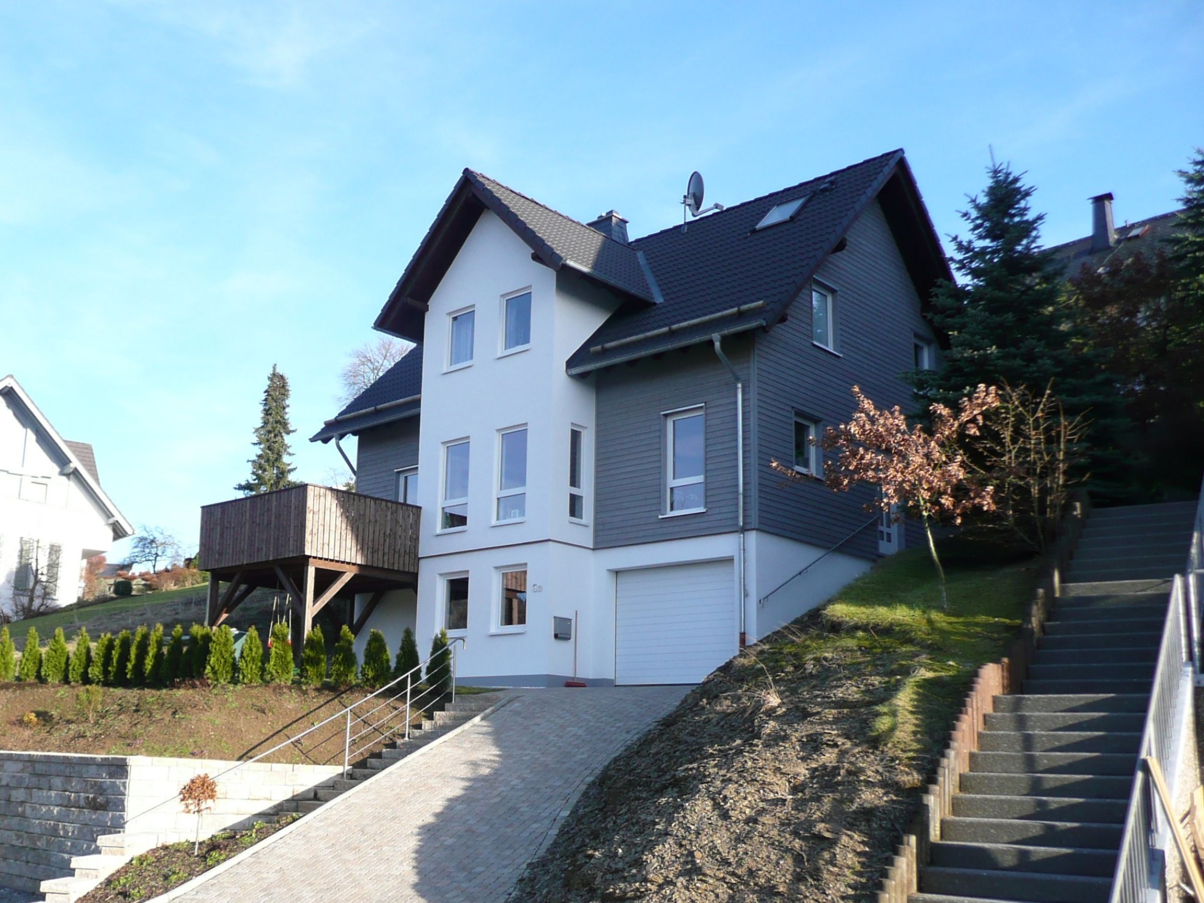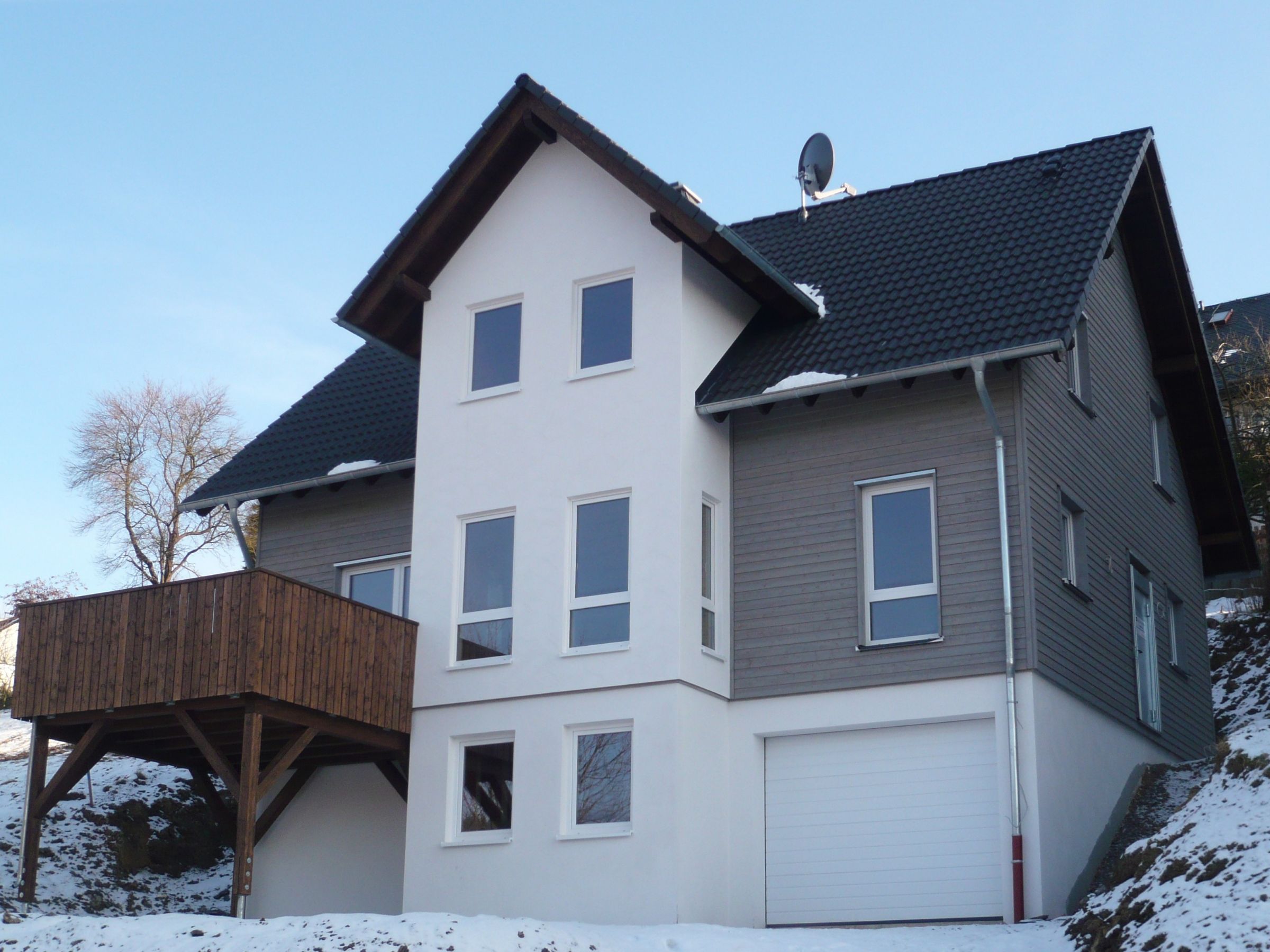 Um die starke Hanglage des Grundstückes sinnvoll und optimal auszuschöpfen, wurde das Gebäude mit drei Etagen geplant. Der so entstandene Halbkeller integriert eine Garage mit direkter Anbindung und Zugang zum Haus. Bei der Ausgestaltung der Fassade wurde ein Kontrast zwischen Holz- und Putzfassade gewählt. Der sich über alle drei Stockwerke erstreckende Erker setzt sich mit seiner hellen Putzfassade vom restlichen Gebäude ab.