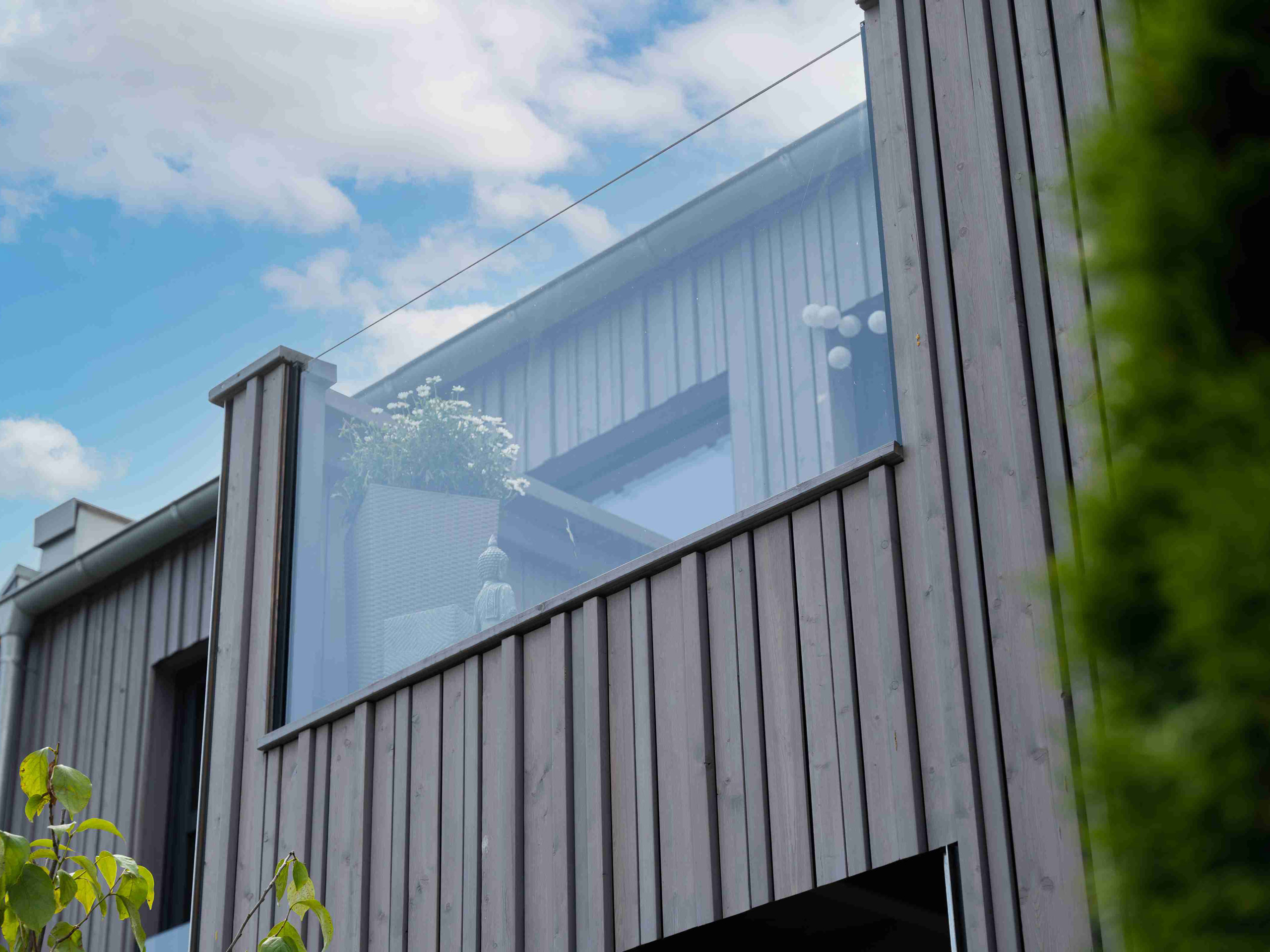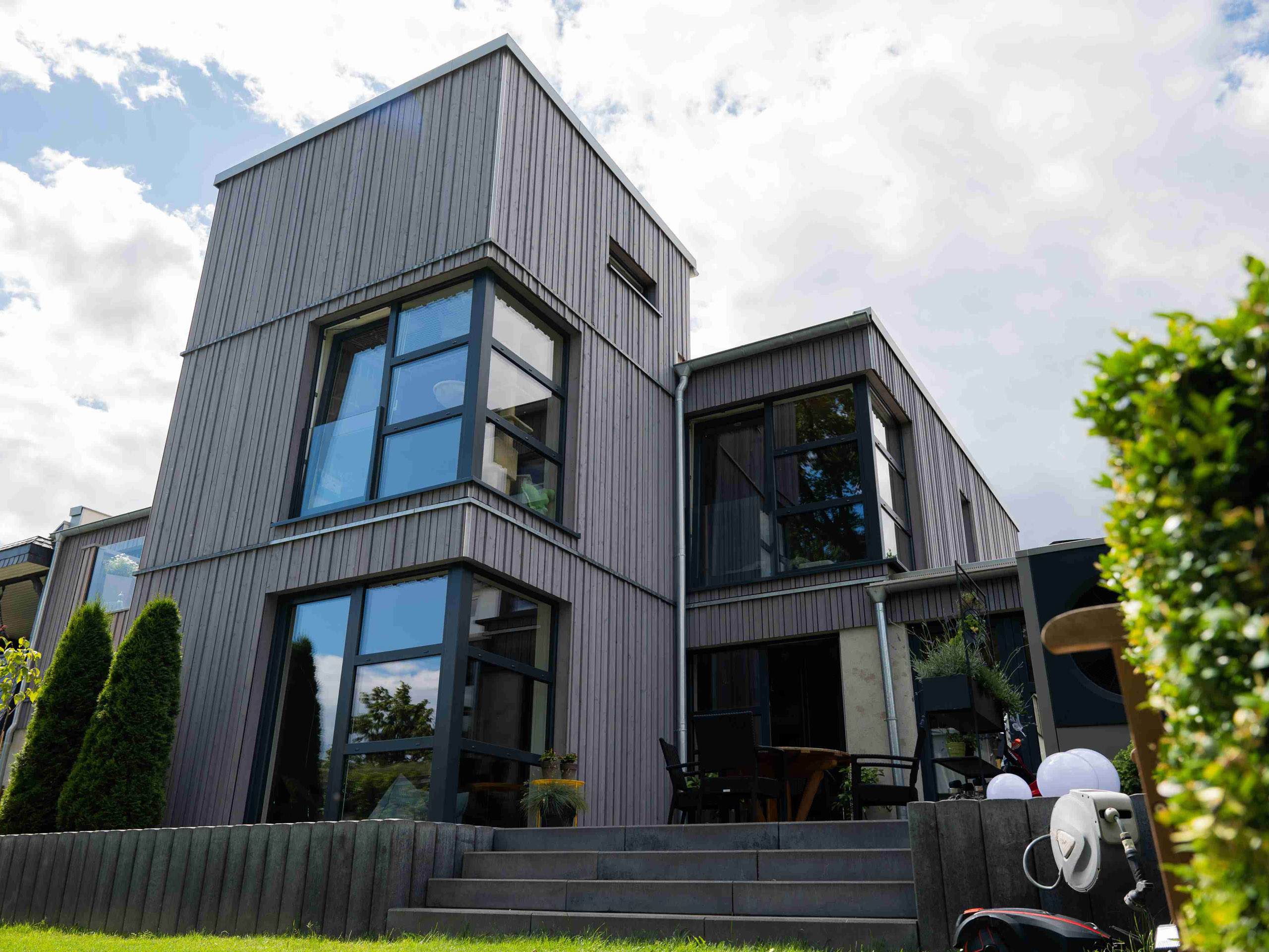 Neben der klaren, kubischen Bauform des Hauses mit Flachdach fällt bereits beim ersten Blick die einzigartige Fassade auf. Die moderne Holzfassade Skyline Kontrast von Ladenburger ist komplett aus Lärchenholz gefertigt und verleiht dem Architektenhaus einen exklusiven, individuellen Charakter.