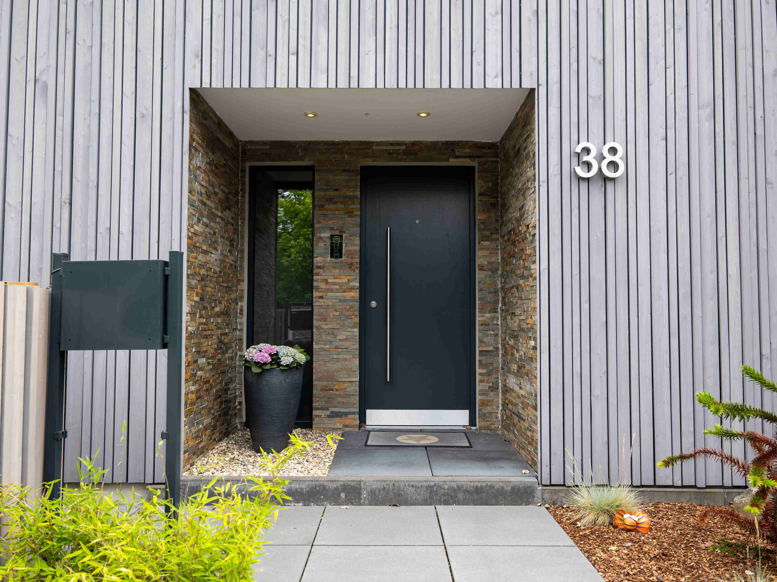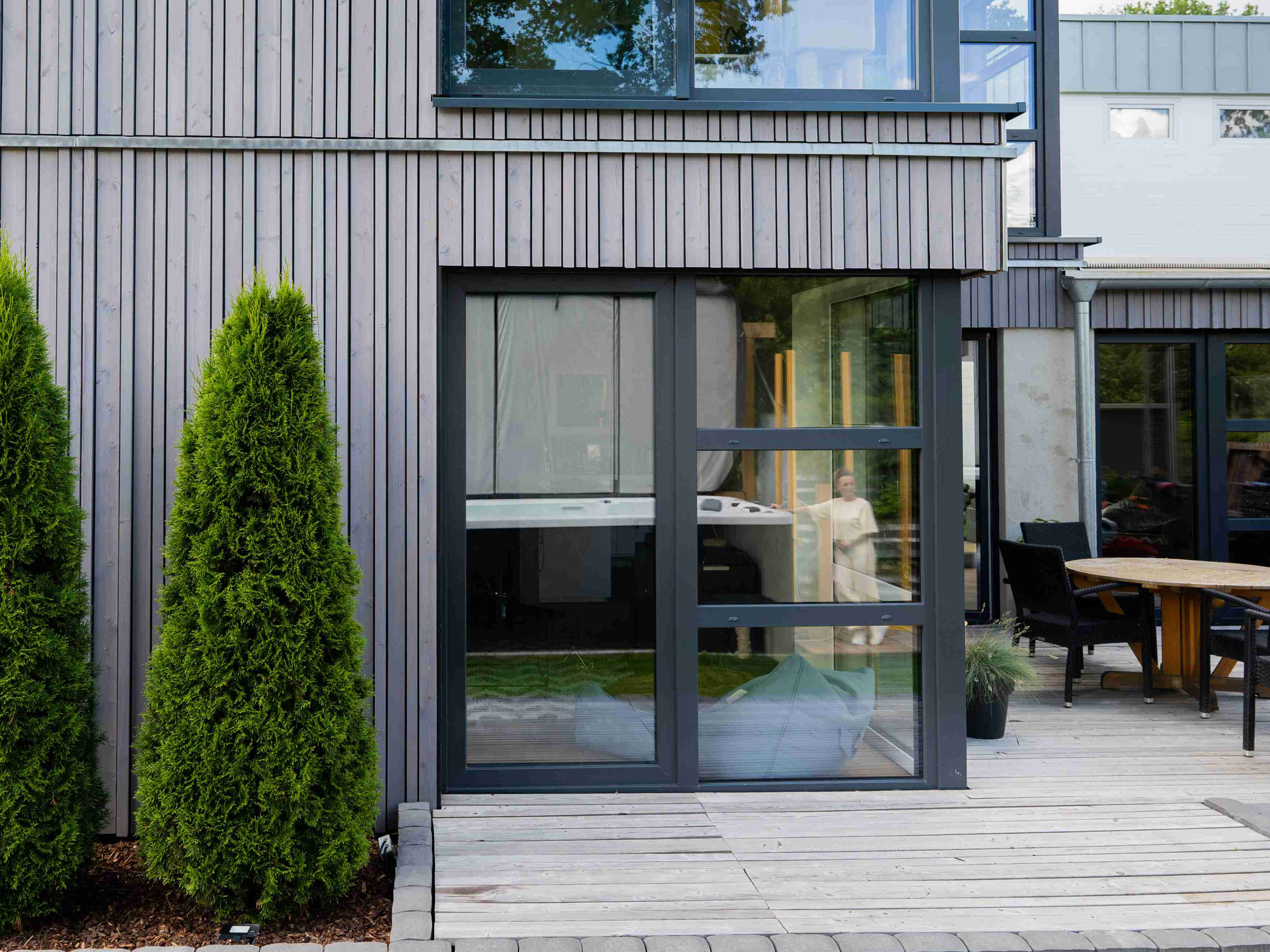 Das Haus wurde in Hanglage erbaut, die sichtgeschützte Außenterrasse mit Garten lädt zum Entspannen und Spielen ein.