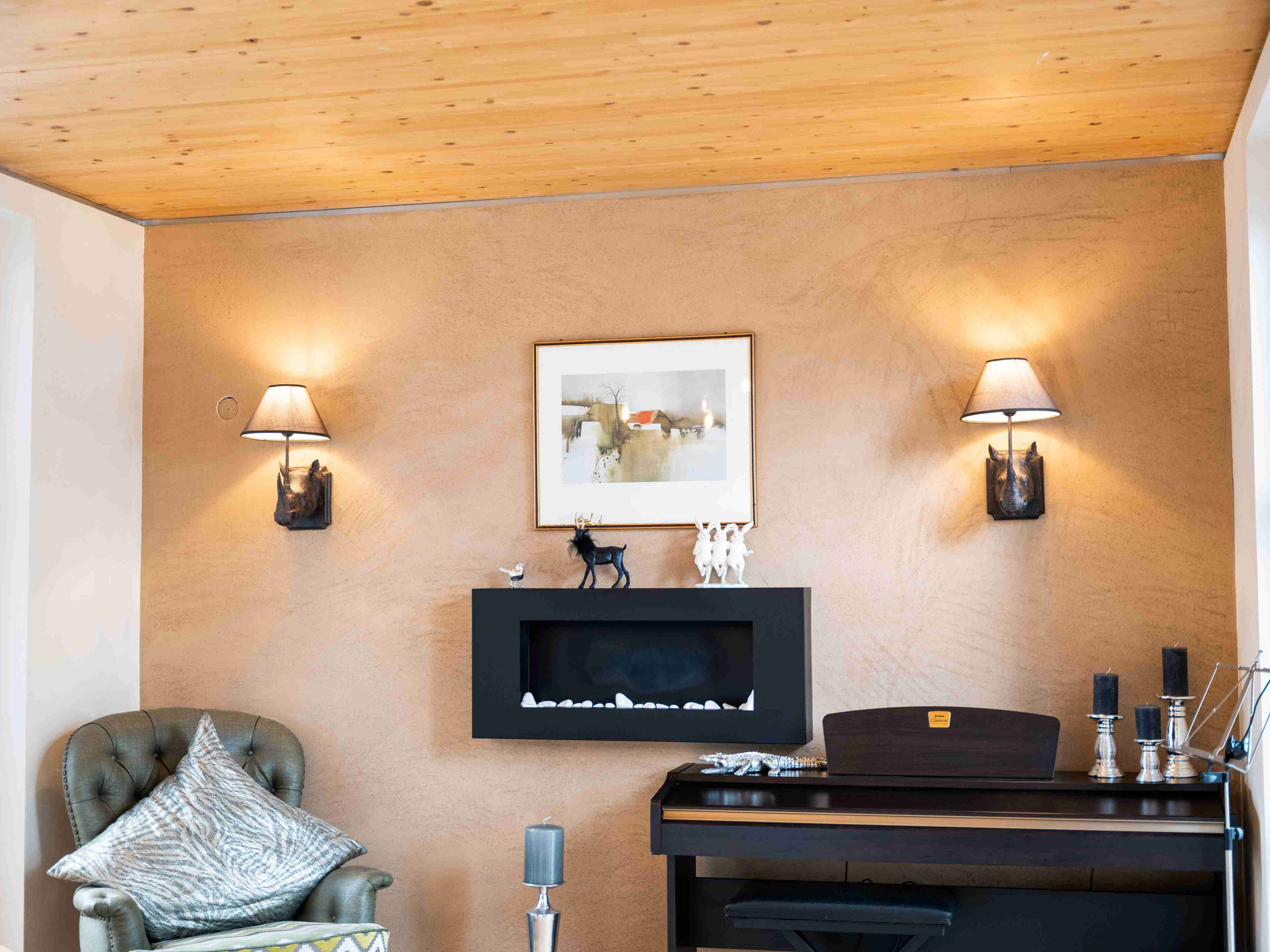 Auch im Inneren des Hauses spielt der Baustoff Holz eine große Rolle. So wurden beispielsweise Massivholzdecken verbaut, die das natürliche Wohngefühl unterstreichen. Für die nachhaltige Beheizung des gesamten Hauses sorgt eine moderne Luft-Wasser-Wärmepumpe.