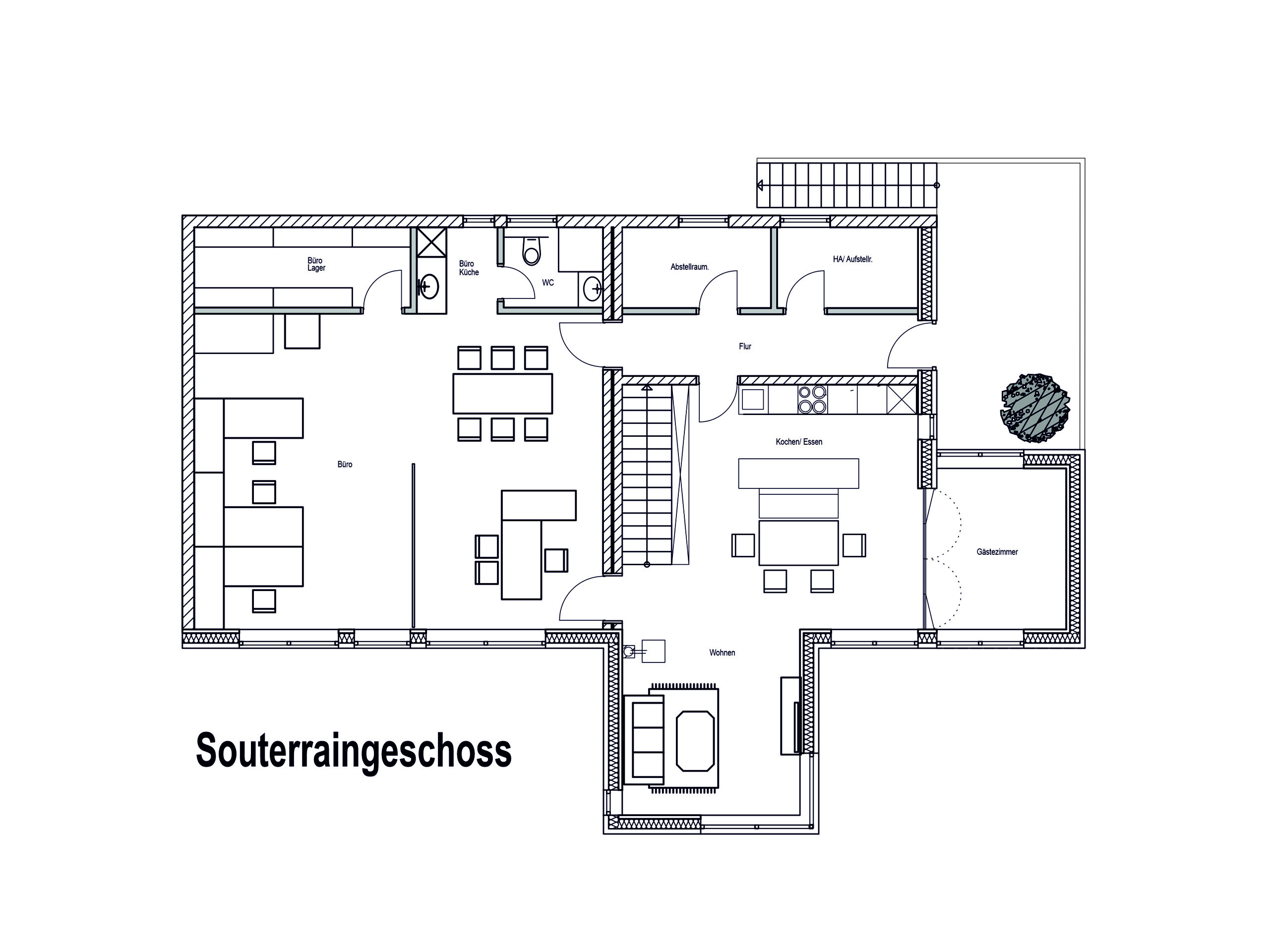 Die Bürofläche umfasst 83 m² und liegt ebenfalls im Souterrain. Sie lädt mit einem großzügig angelegten, offenen Raum zum kreativen Arbeiten ein und ist zudem mit einem Lagerraum, Küche und WC ausgestattet. Die Büroräume sind von der Hauptwohnung aus zugänglich.