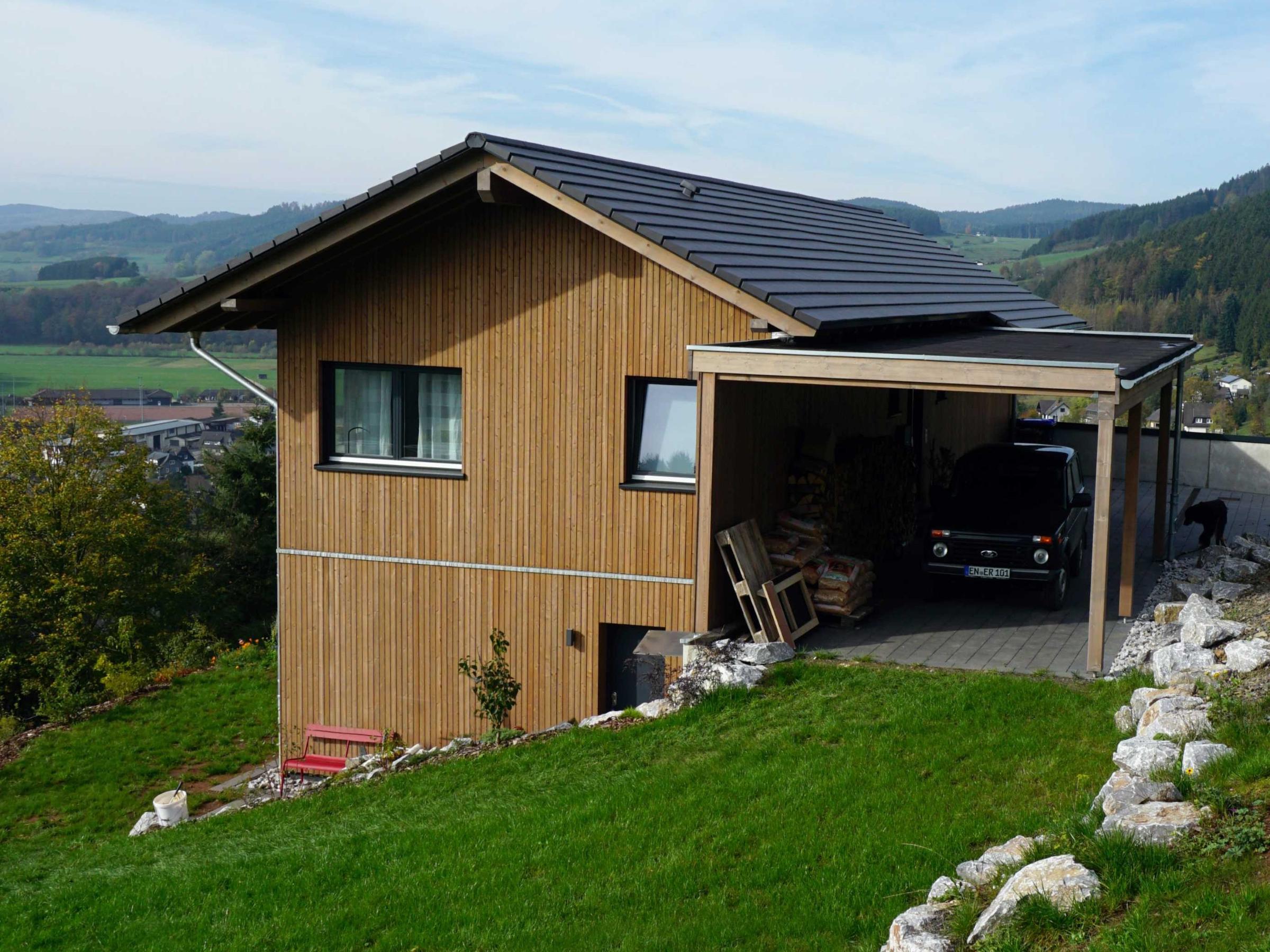Der Wunsch der Bauherren nach einem Rückzugsort in der Natur spiegelt sich durchgängig in der Bauweise wieder. Der Naturbaustoff Holz ist rundum präsent und kam nicht nur bei der Fertigung der Holzrahmenbauwände sondern auch bei der Gestaltung der Fassade zum Einsatz. Die lotrechte Lärchenfassade im Farbton „antikgrau“ verleiht dem Ferienhaus einen ganz besonderen und alpin anmutenden Flair. Vom überdachten Balkon auf der Rückseite des Gebäudes können die Bauherren eine wunderbaren Ausblick in die Landschaft genießen.