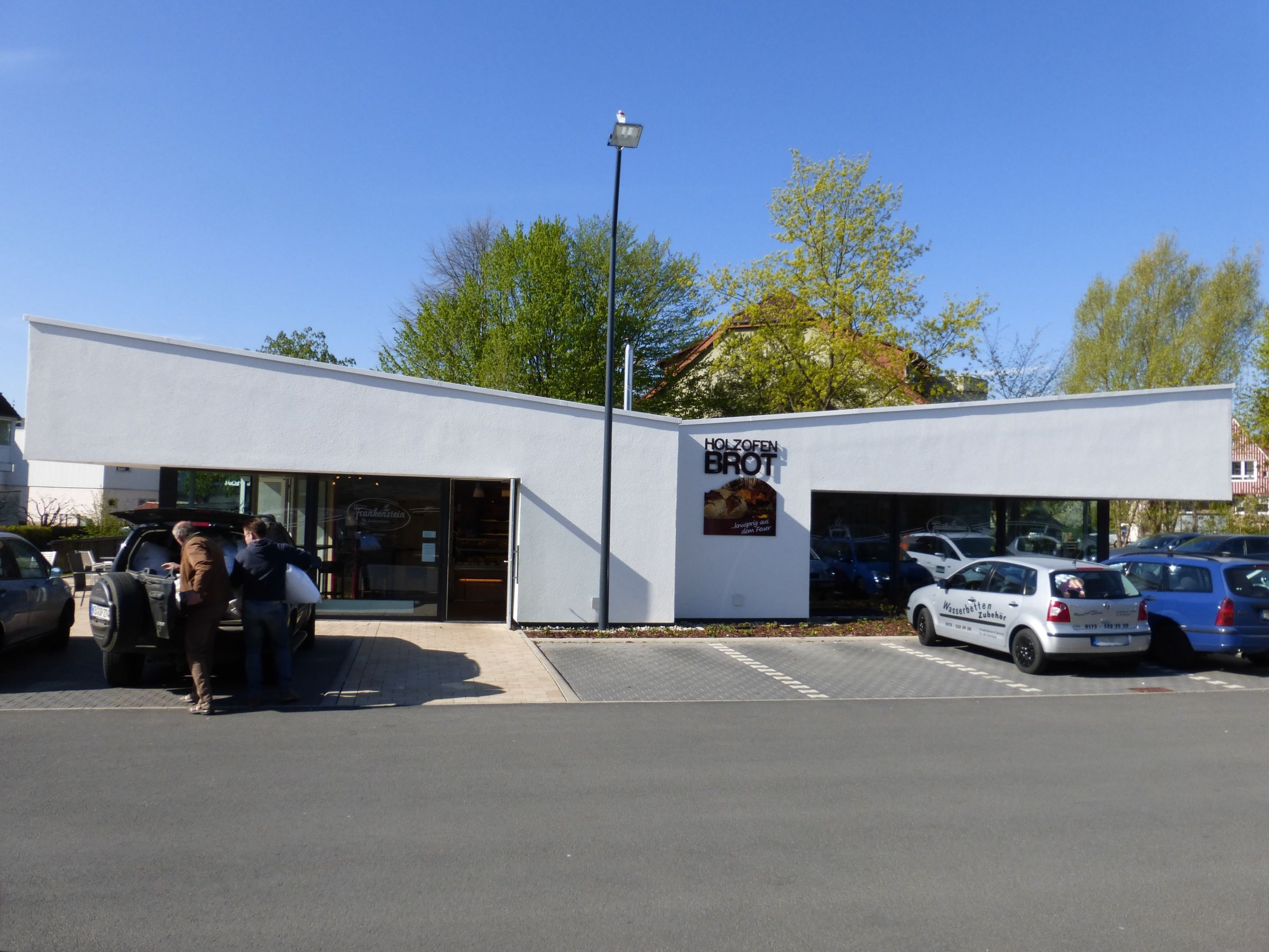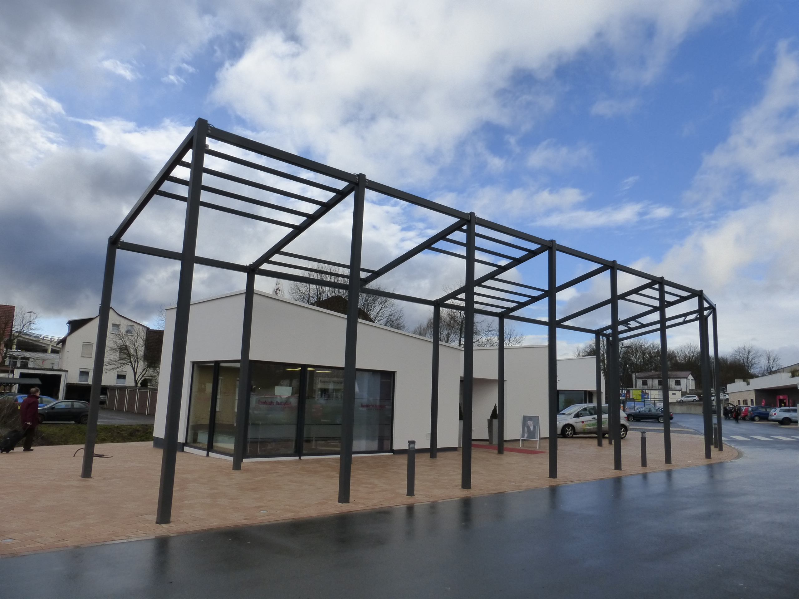Die Pavillongebäude im Zentrum von Korbach haben eine optimale Lage, um als gewerbliche Fläche genutzt zu werden. Die asymmetrische Form und die weiße Putzfassade lassen nicht auf Anhieb einen Holzbau erwarten. Doch tatsächlich sind die Gebäude vollständig in Holzrahmenbauweise errichtet worden.
