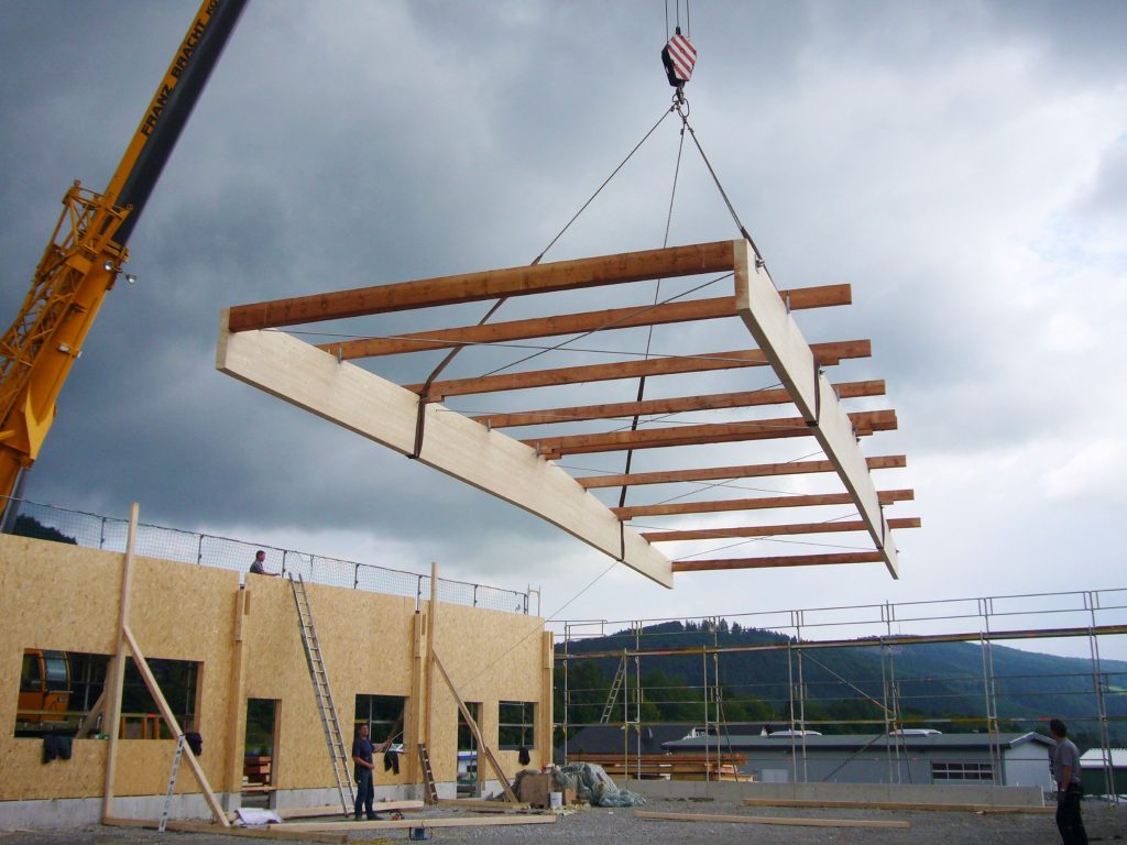 Die 30 x 20 Meter lange Halle beherbergt die Produktion und Vorfertigung eines Tischlereibetriebes. In der Tischlerei ist der Baustoff Holz das täglich Brot. So lag es nahe, dass auch die Halle in Holzbauweise errichtet wurde. Sechs 20 Meter lange Brettschichtholzbinder erstrecken sich längs über die Halle.
